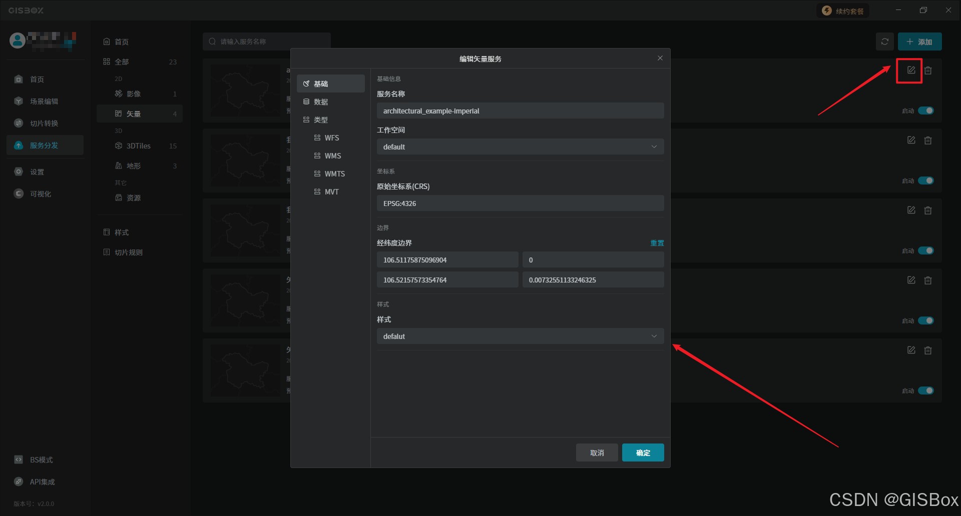 5、点击服务又上角的“编辑”图标,即可编辑矢量服务,如:基础信息、数据路径以及发布的协议类型。