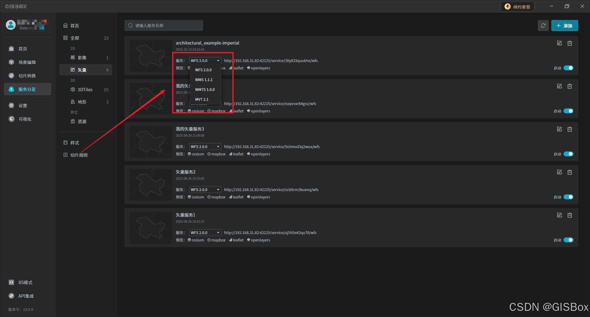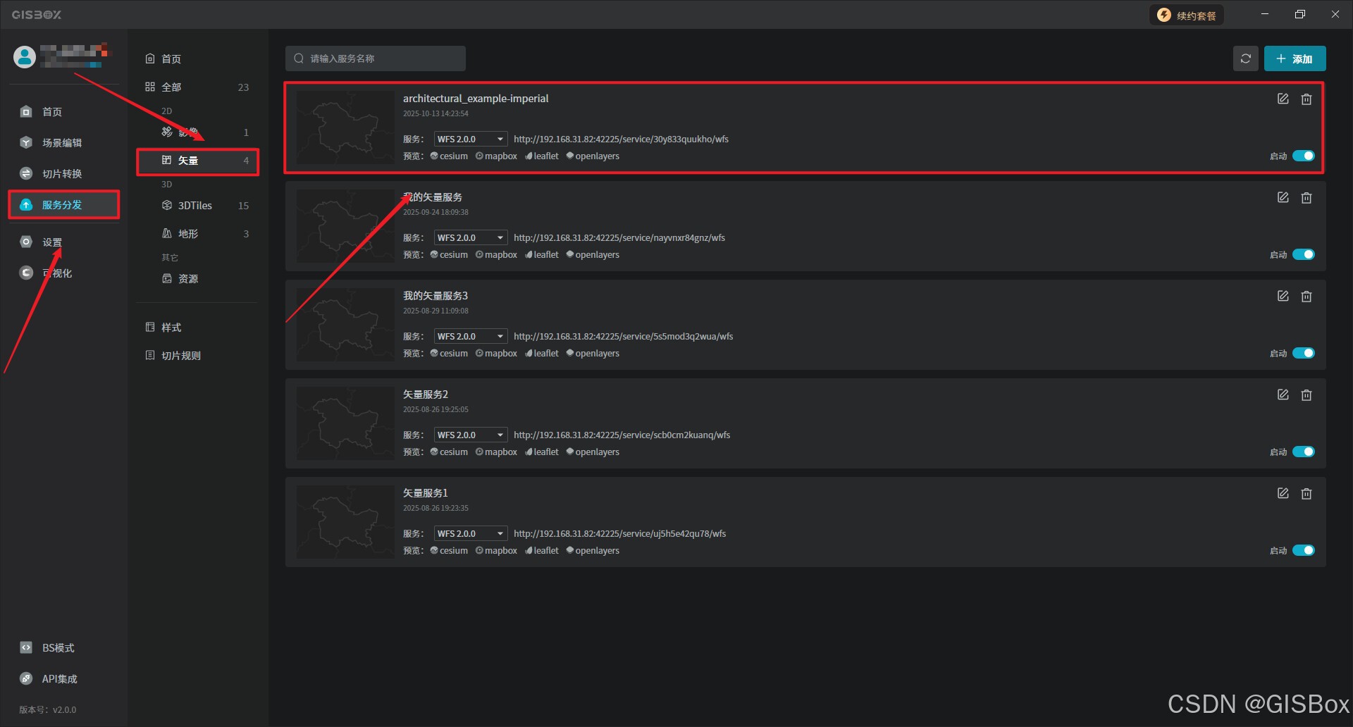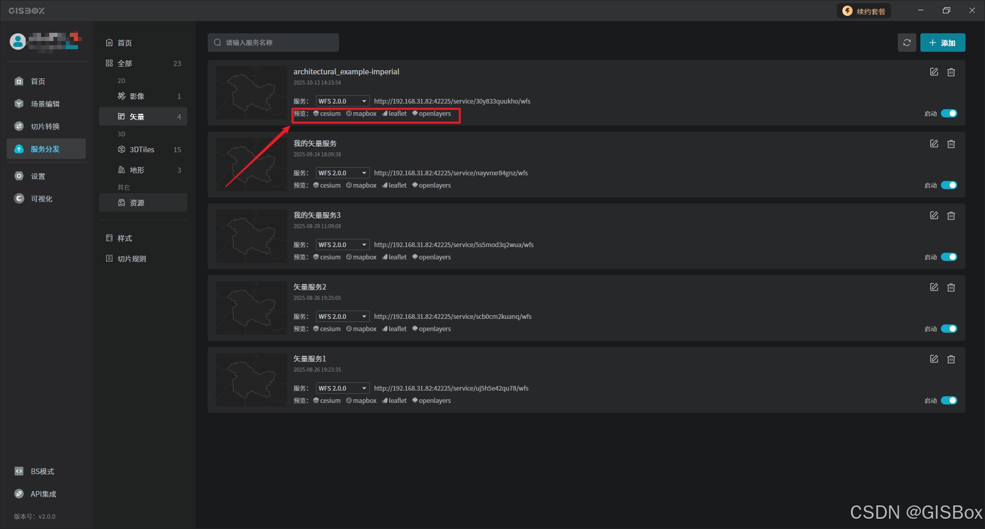 7、矢量服务中提供了四个“预览框架”(cesium/mapbox/leaflet/openlayers),点击直接可以在浏览器中查看其渲染效果。生成的服务地址也可以直接运用到数字孪生平台中。
