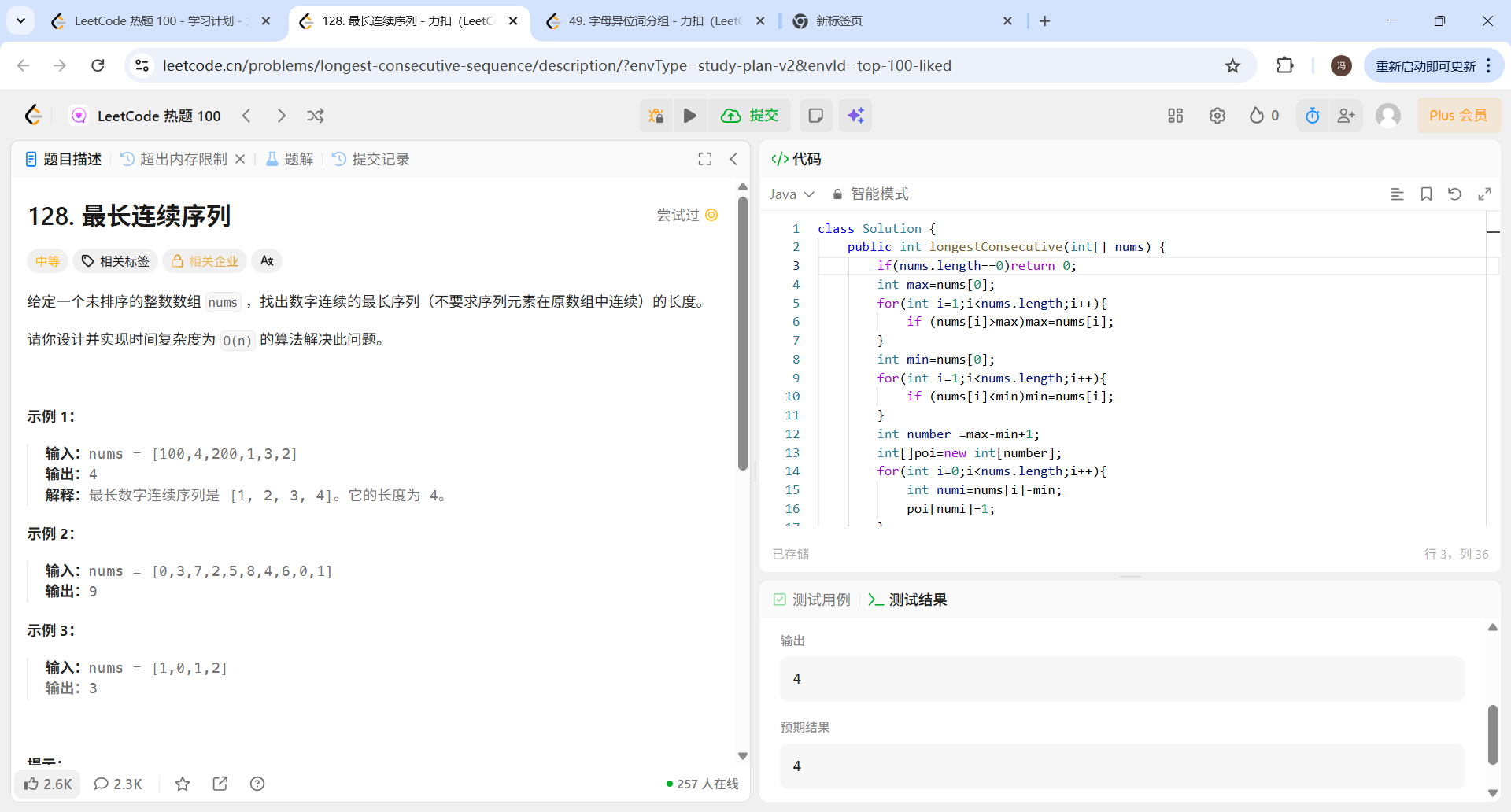class Solution {public int longestConsecutive(int[] nums) {Set<Integer> set = new HashSet<>();for (int num : nums) {set.add(num);}int longestNum=0;for (int num : set) {if (!set.contains(num +1)) {int currentNum=1;int current=num;while (set.contains(current-1)){current=current-1;currentNum+=1;}if (currentNum>longestNum){longestNum=currentNum;}}}return longestNum;}