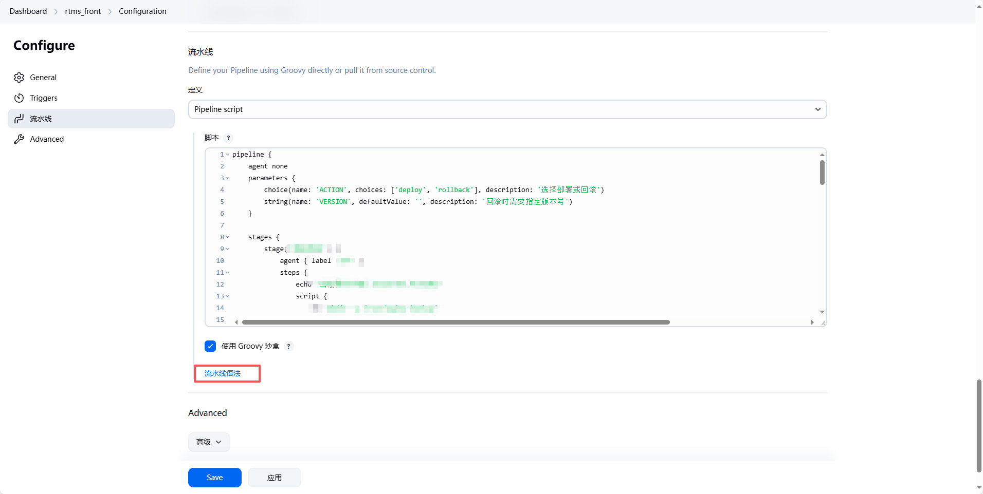 根据自己项目的需求去编写流水线语句,可以点击下方的流水线语法生成示例,再修改也可以;