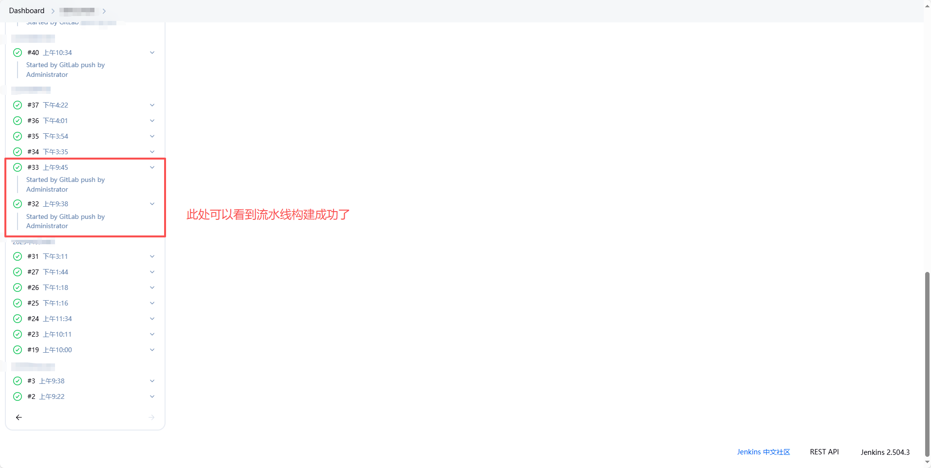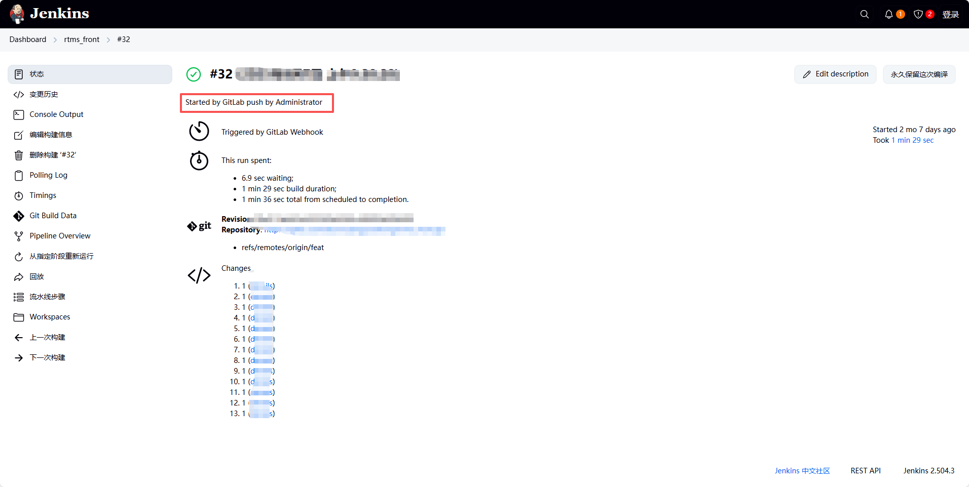 上述配置完成后,整个自动化过程就配置完成了,我们可以在gitlab配置webhooks中点击测试,看以下Jenkins的构建过程;
