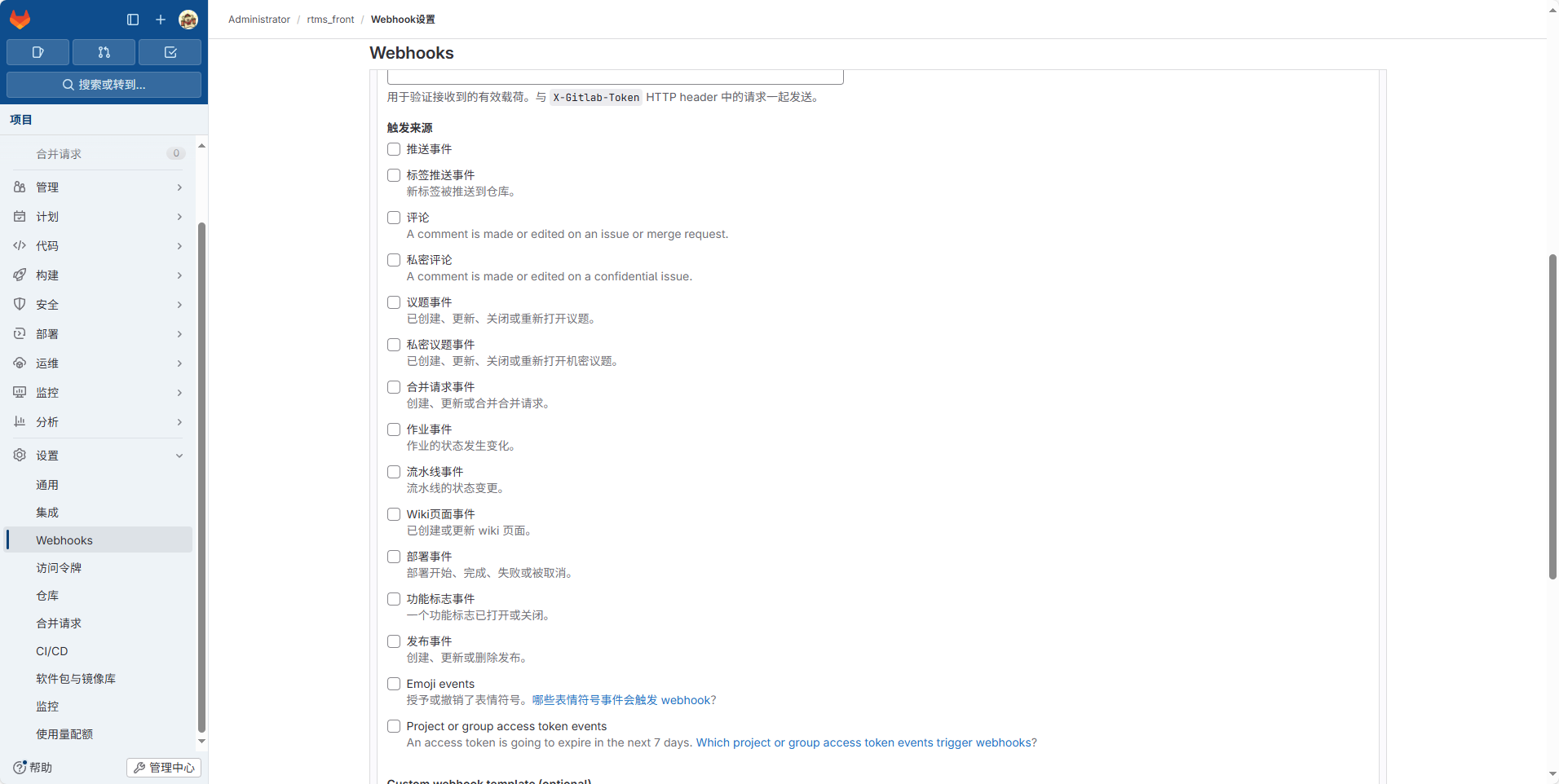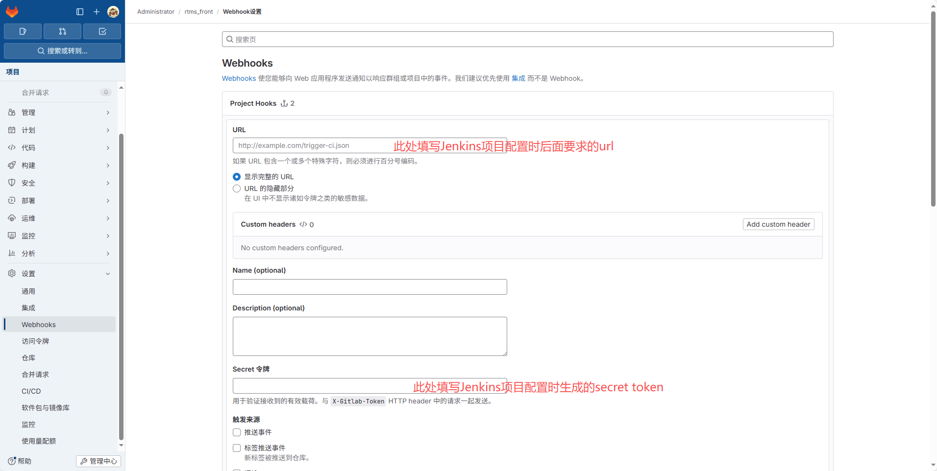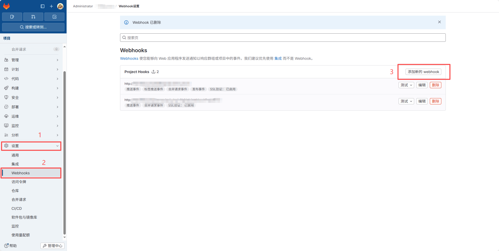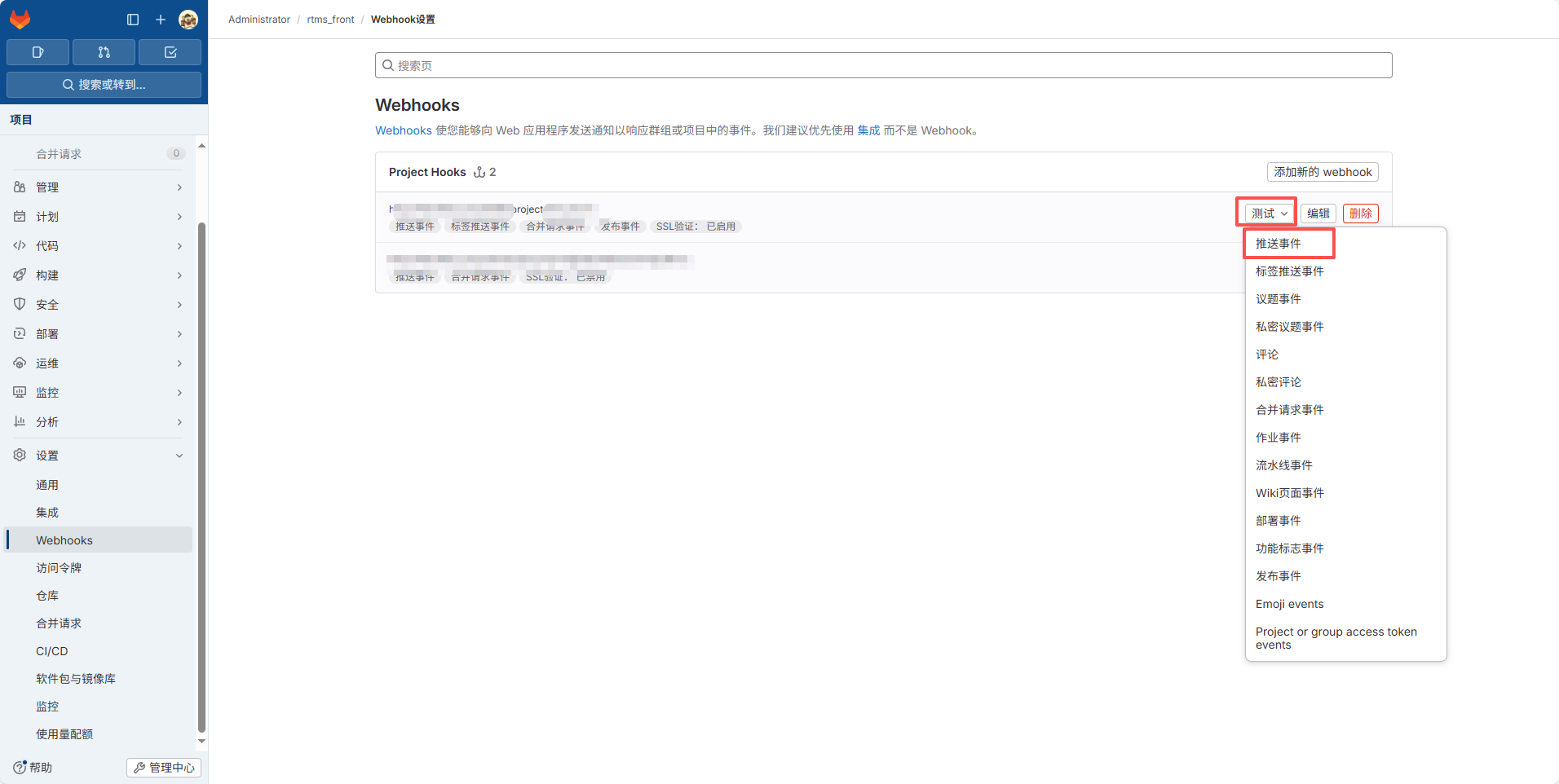 再项目设置里面选择webhooks,选择添加新的webhooks;