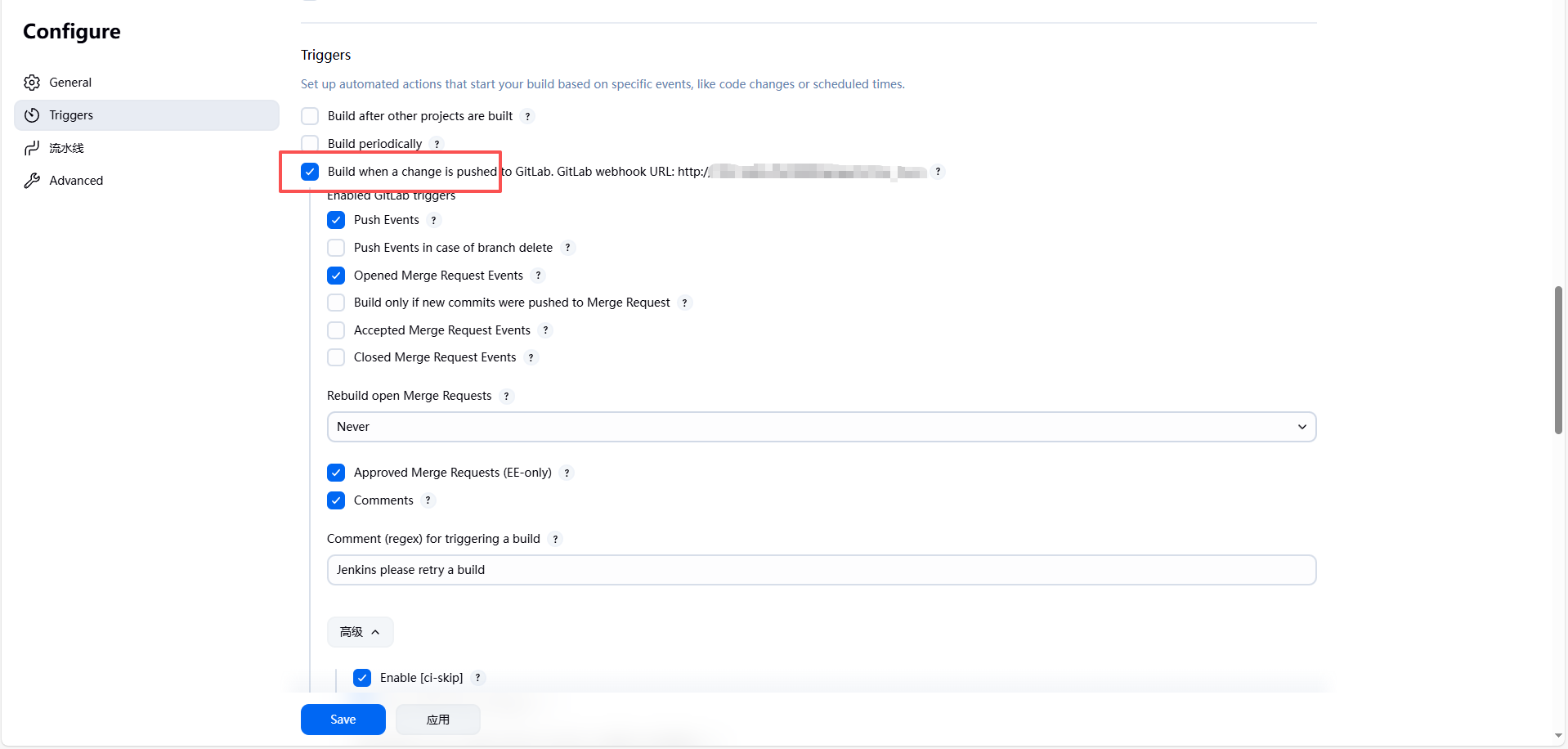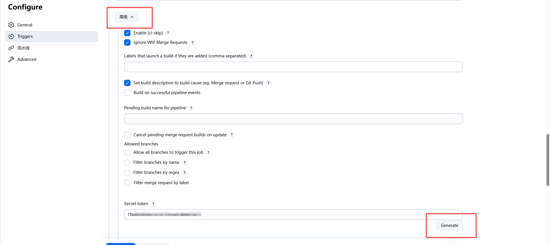进入项目配置页面,配置触发器triggers,勾选gitlab的那个选项,然后点击高级里面的secret部分的generate;