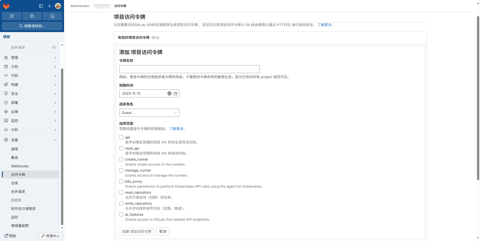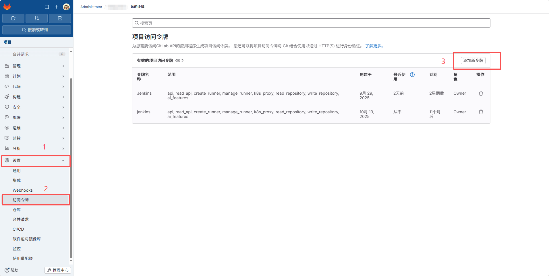 点击所需要设置的项目,选择设置中的访问令牌,并选择添加新令牌;