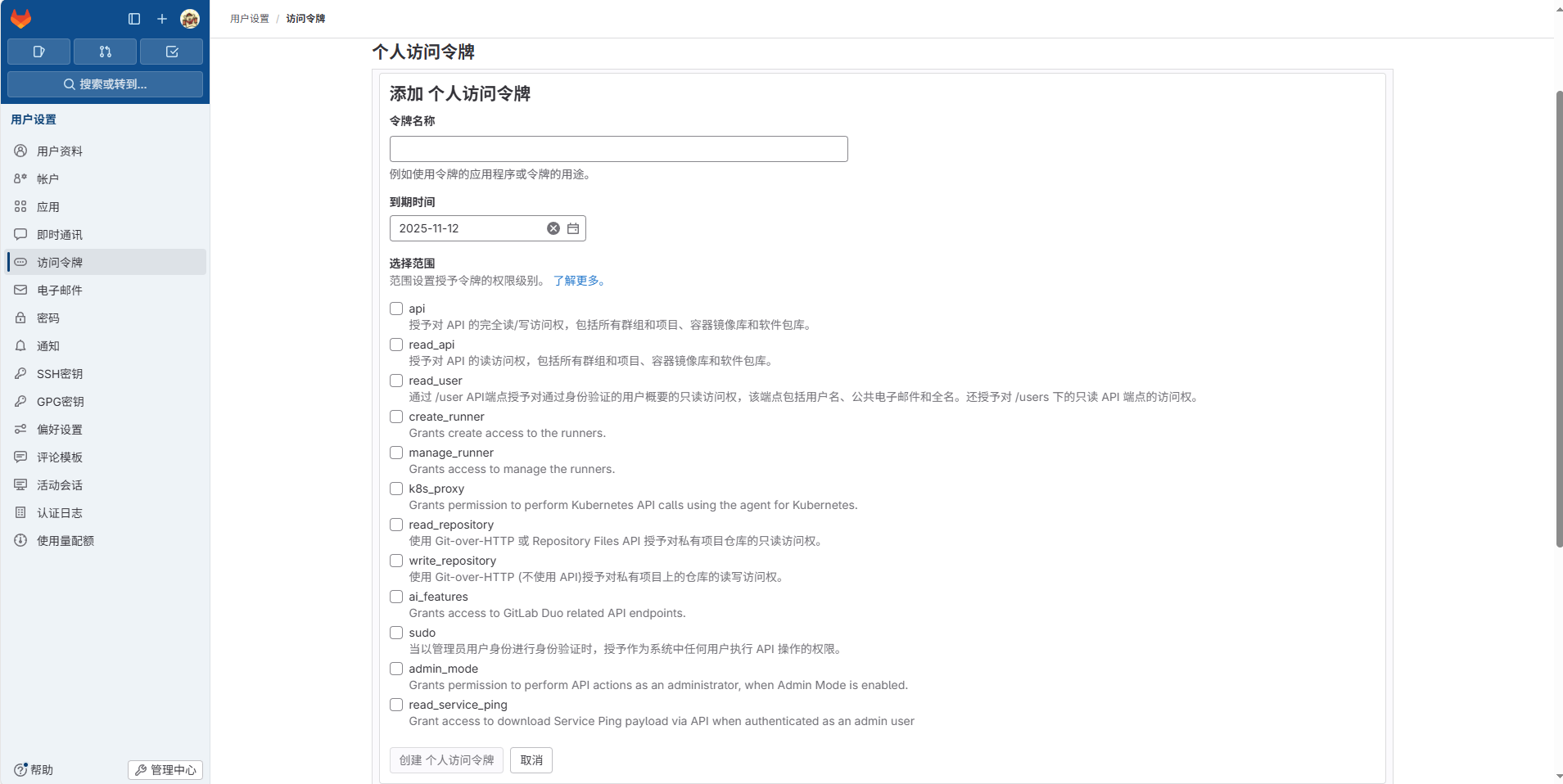 根据实际需求选择权限和到期时间,最后点击创建新令牌即可;创建完成后,复制一下令牌内容到文档里,避免刷新之后就看不了了;