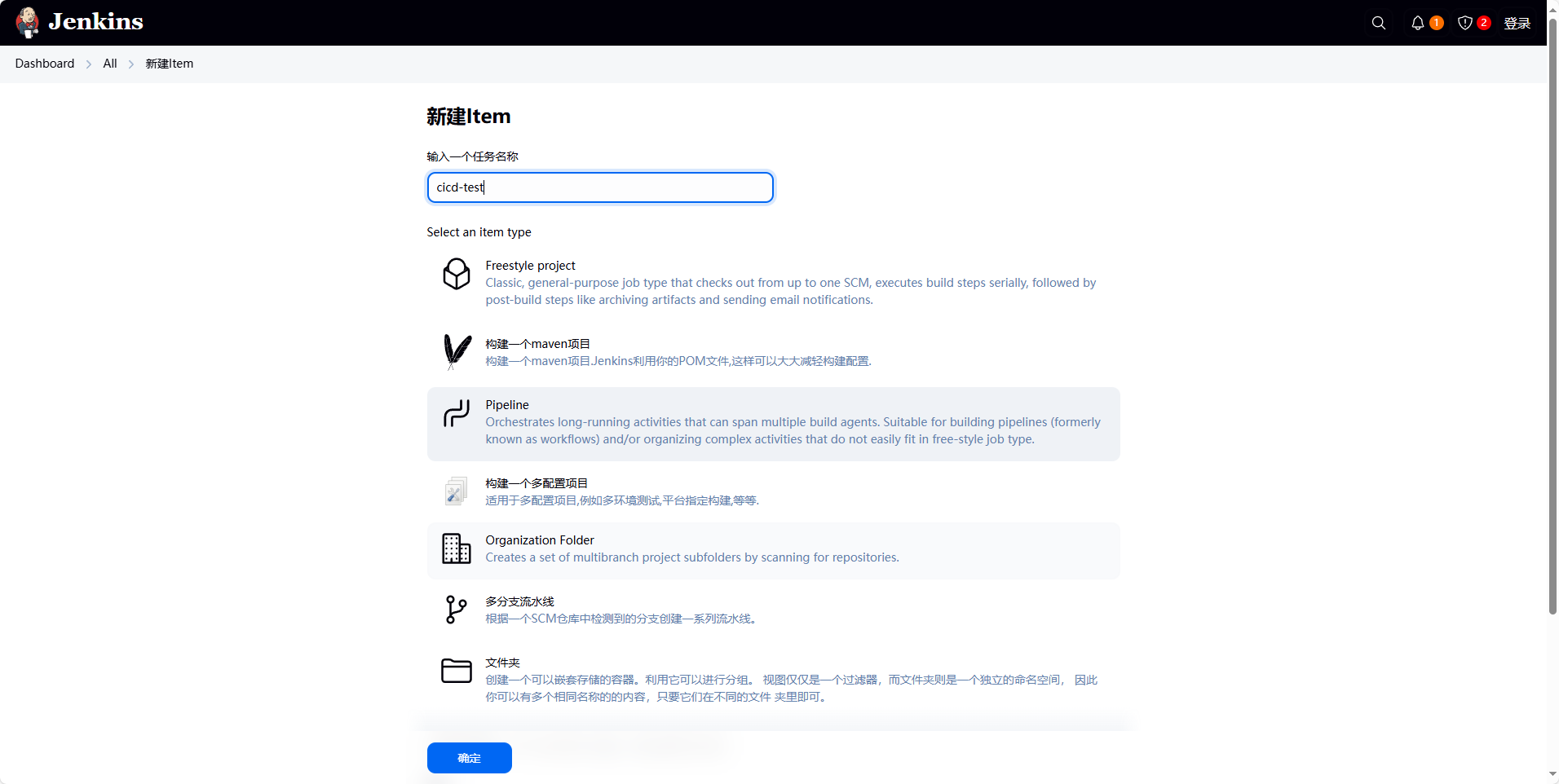 点击新建item,输入项目名称,选择项目类型,此处使用的为pipeline 流水线;