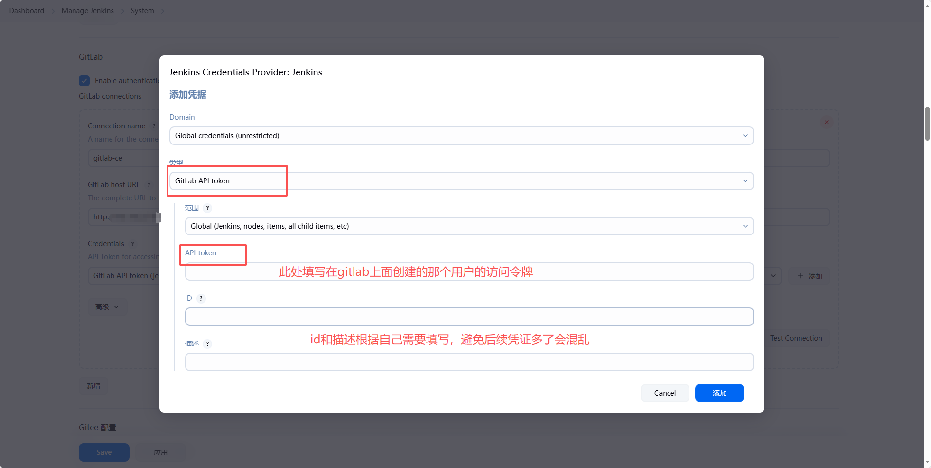输入gitlab的url地址,点击右侧的添加去创建凭证;选择gitlab api token,再填入信息即可