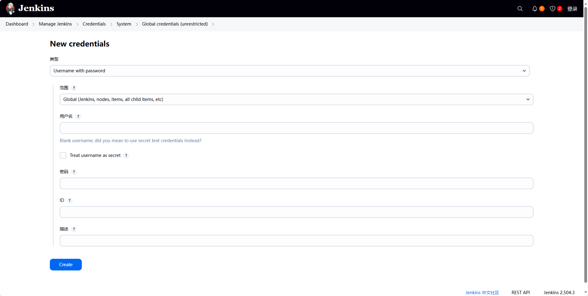 在manage Jenkins中选择credentials,点击system,选择Global credentials (unrestricted),选择add credential;