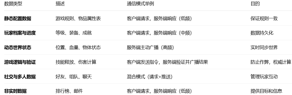 而实际上由于AI时代的到来,通过查询GPT工具得知,游戏后端的交互数据类型十分丰富。以下展示AI搜索结果。