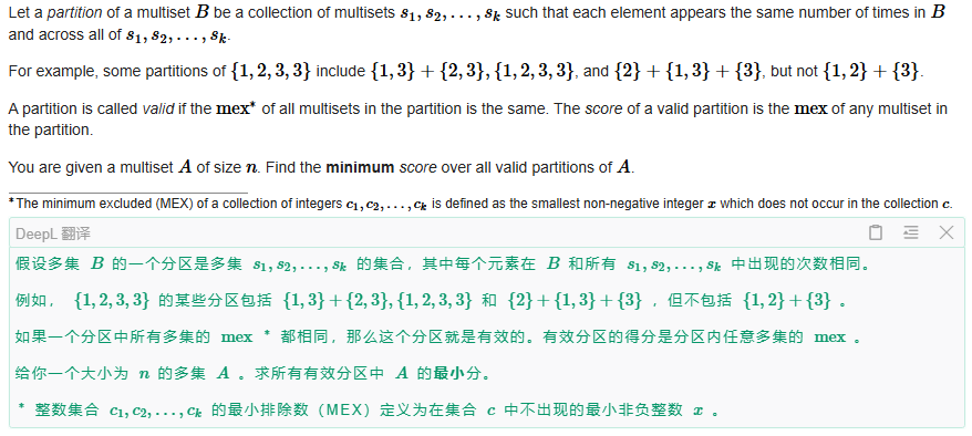 大致说一下题意:就是给你一个多重集合 BBB(其中元素允许重复),然后要你把它划分成好几块,使得每一块的 MEX 一样(MEX 是啥我就不多说了),请问在所有划分中总 MEX 最小是多少。