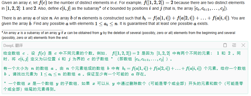 其实说白了就是已知有一个 bbb 数组的构造方式是这样的:bi=f(a[1,i])+f(a[2,i])+⋯+f(a[i,i])b_i=f(a[1,i])+f(a[2,i])+\dots+f(a[i,i])bi=f(a[1,i])+f(a[2,i])+⋯+f(a[i,i])(其中 fff 表示这一段区间内不同的元素个数,[x,y][x,y][x,y] 表示区间 x→yx\to yx→y,包含 x,yx,yx,y)。现在给你一个 bbb 数组,问你 aaa 数组的一种可行的构造方法是什么。