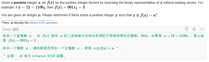 题目大意: 给你一个数,问它是否能由一个数在二进制下的数与把这个二进制数翻转过来(不是按位反转)后的数异或起来构成。