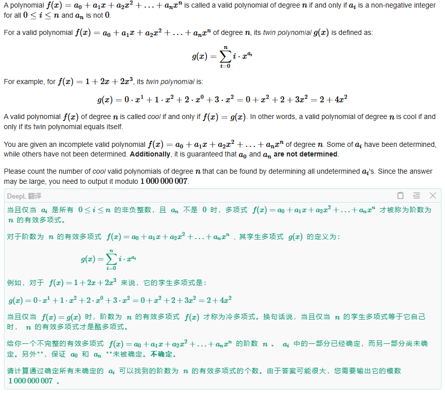 {cin>>t;PO://一种类似于 while 的方法t--;n=read();for(int i=0;i<=n;i++){a[i]=read();}for(int i=1;i<=n;i++){if(a[i]<=0){continue;}if(a[i]>n||a[a[i]]!=-1&&a[a[i]]!=i)//如果不满足性质{puts("0");if(!t){return 0;}goto PO;}a[a[i]]=i;}int cnt=0;for(int i=1;i<=n;i++){if(a[i]==-1)//统计 -1 的个数{cnt++;}}dp[0]=1;for(int i=1;i<=cnt;i++)//DP 转移{dp[i]=2*dp[i-1]%mod;if(i>1){dp[i]=(dp[i]+dp[i-2]*(i-1)%mod)%mod;}}write((dp[cnt]+(a[n]==-1?mod-dp[cnt-1]:0))%mod);putchar('\n');for(int i=1;i<=cnt;i++){dp[i]=0;}if(!t){return 0;}goto PO;