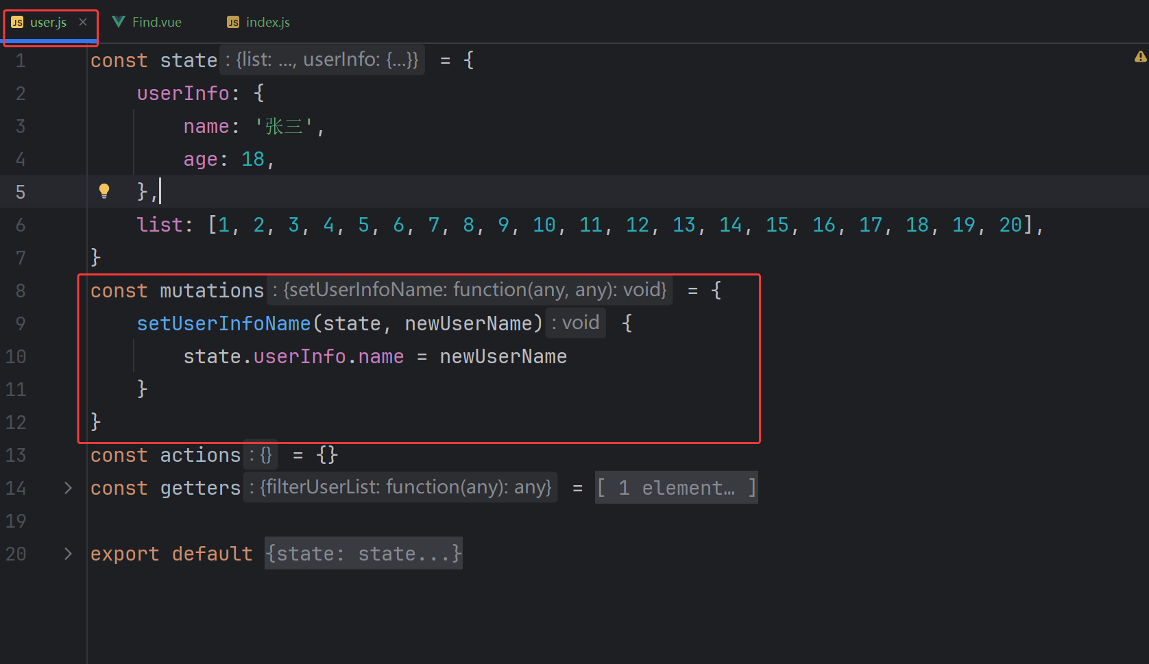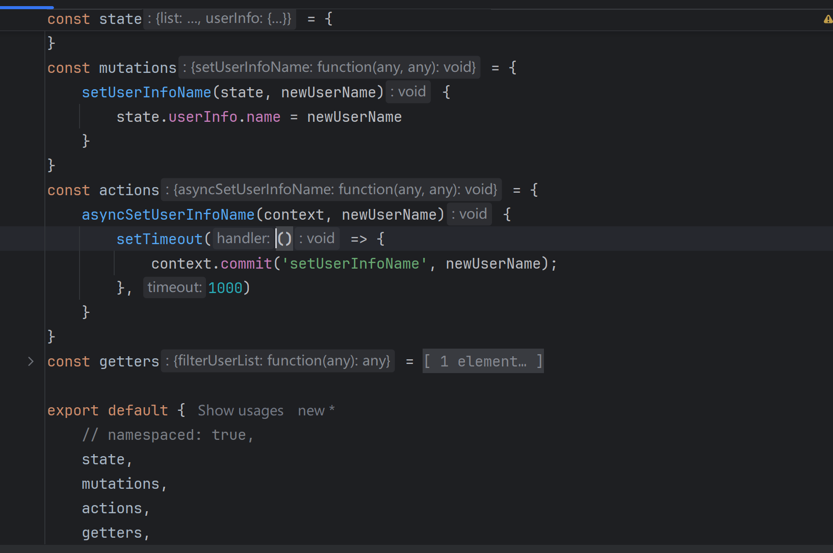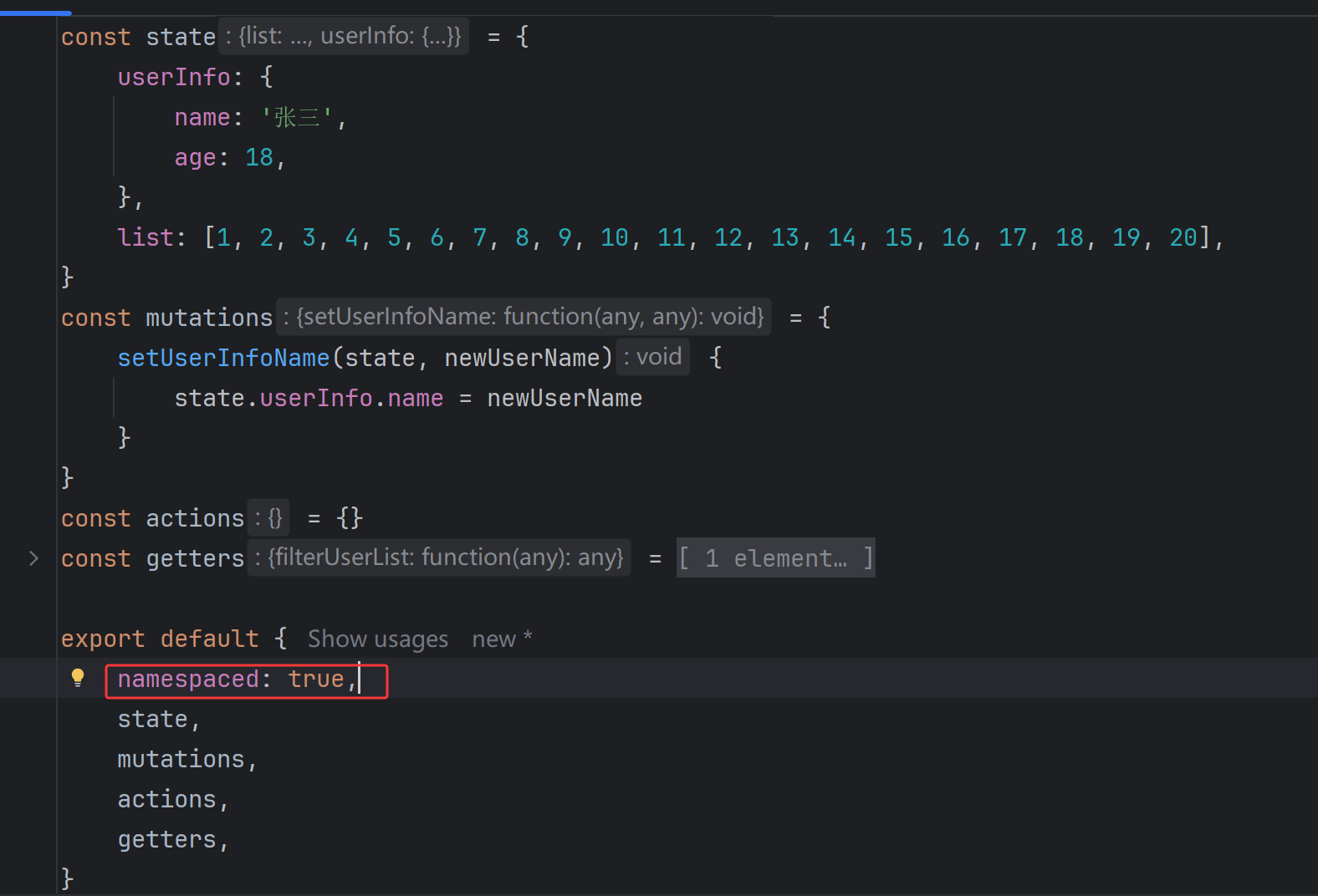 export default {state: { name: '陈陈陈' },mutations: {setName(state, name) {state.name = name}}