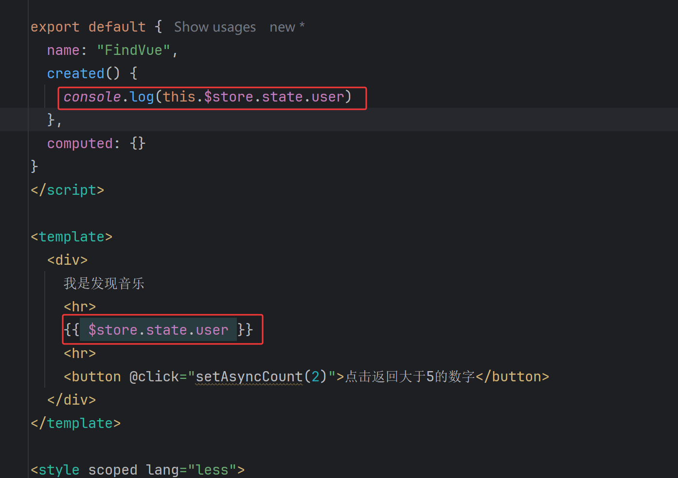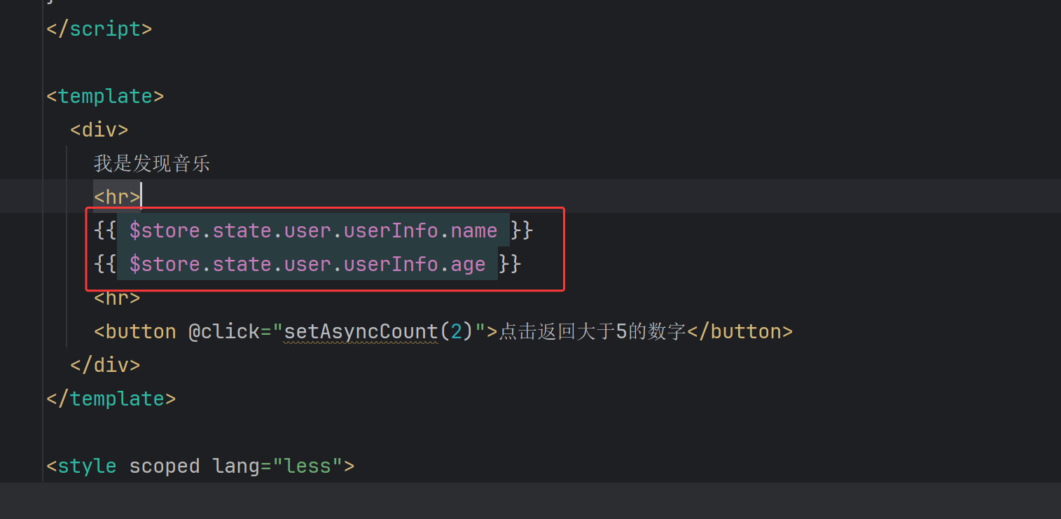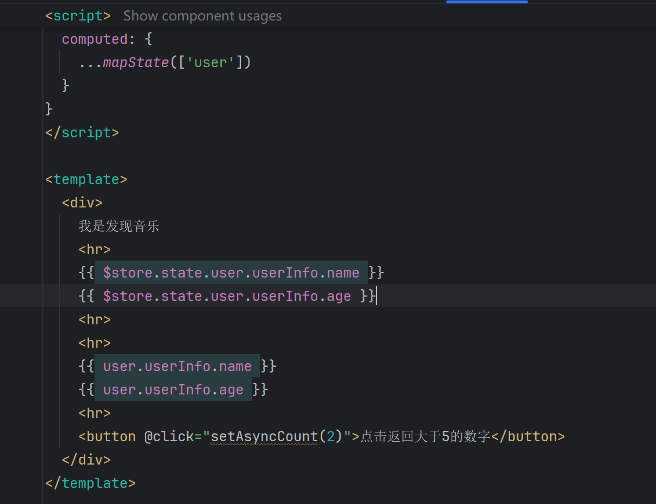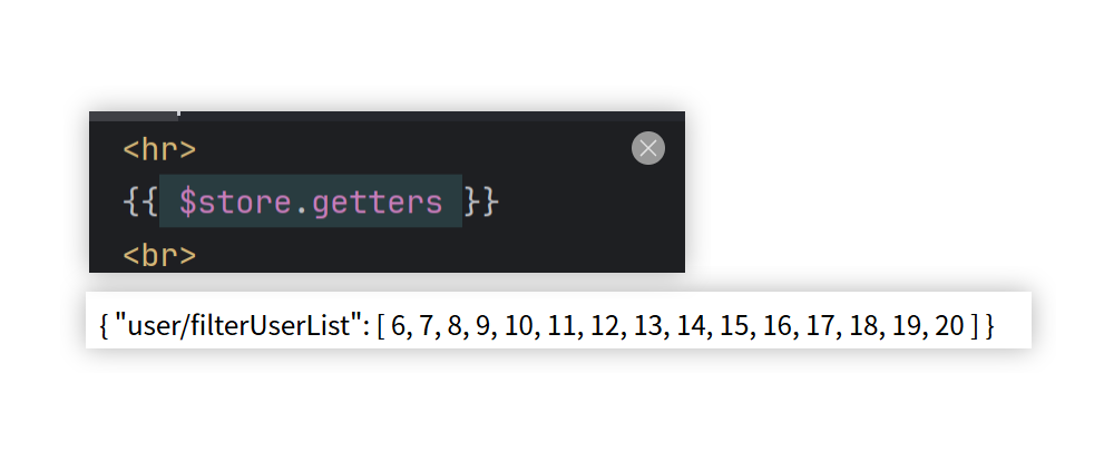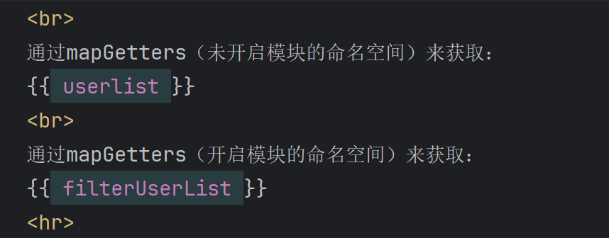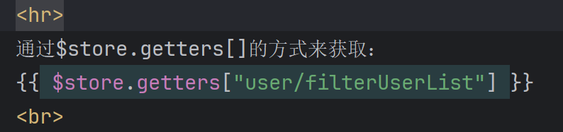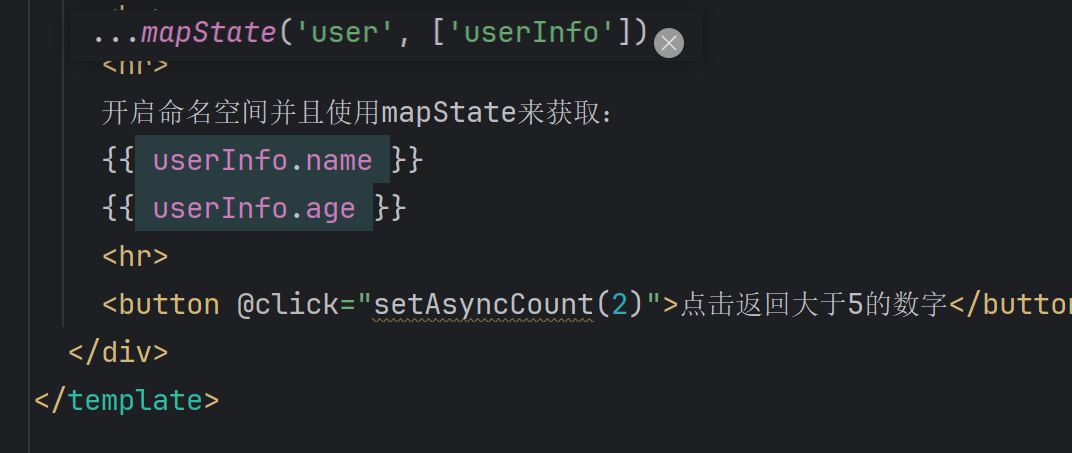</script><template><div><hr>通过$store.getters[]的方式来获取:{{ $store.getters["user/filterUserList"] }}<br>通过mapGetters(未开启模块的命名空间)来获取:{{ userlist }}<br>通过mapGetters(开启模块的命名空间)来获取:{{ filterUserList }}<hr><button @click="setAsyncCount(2)">点击返回大于5的数字</button></div>
