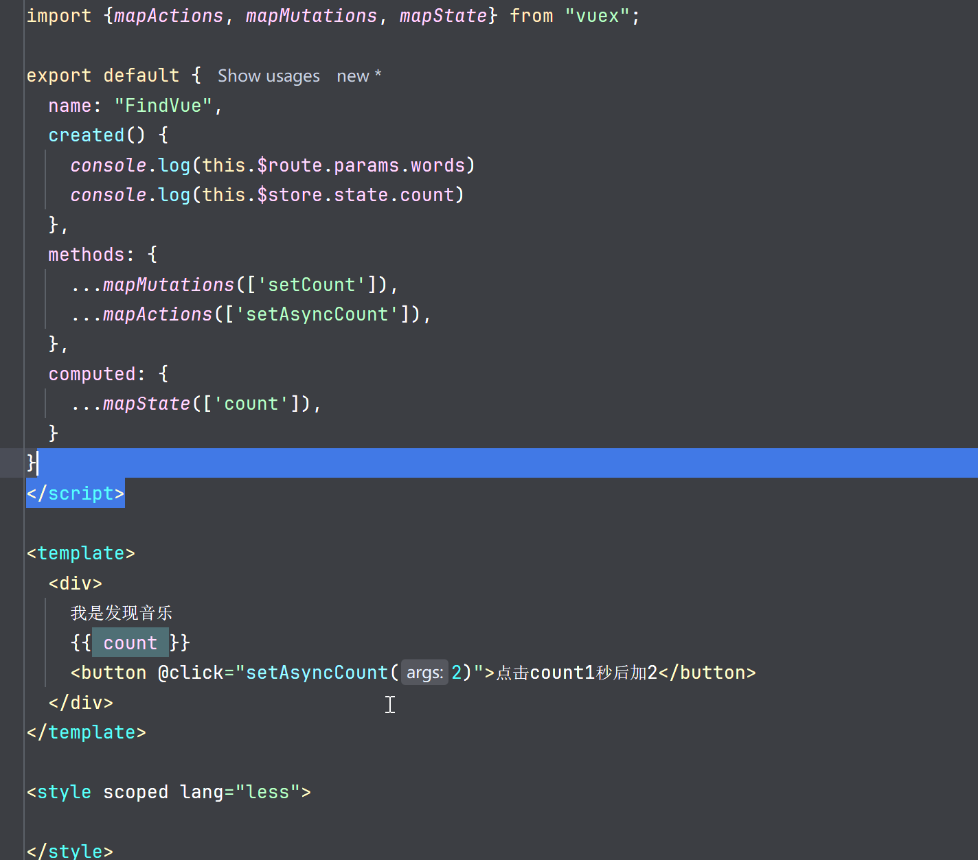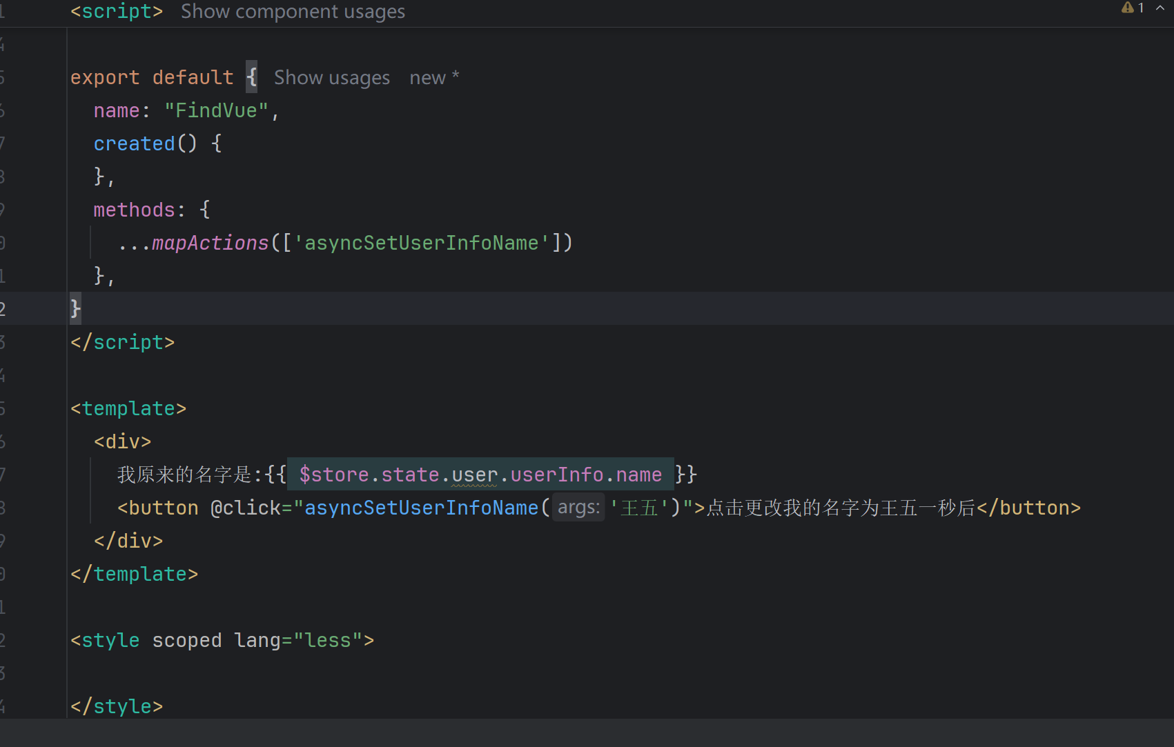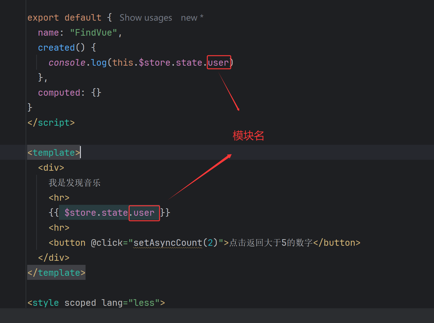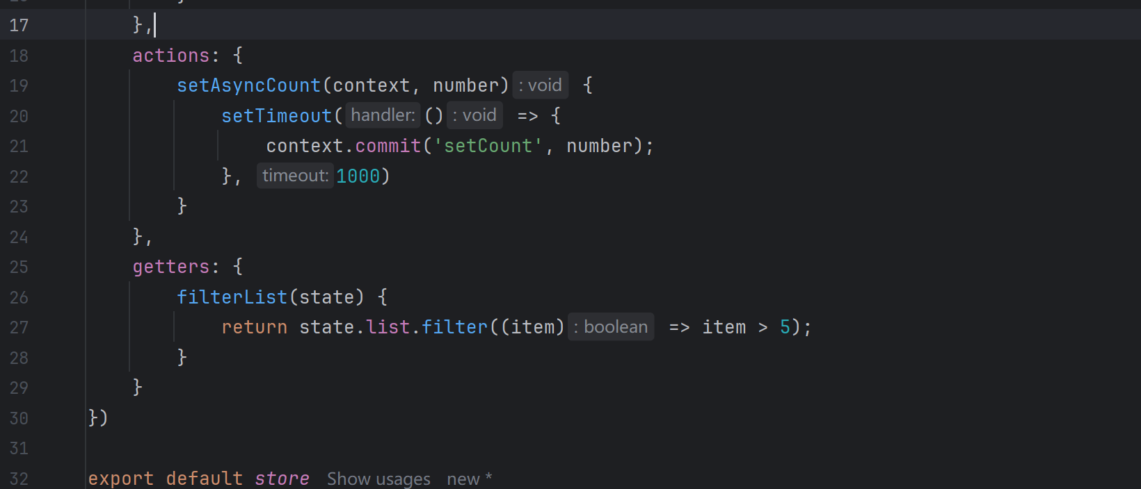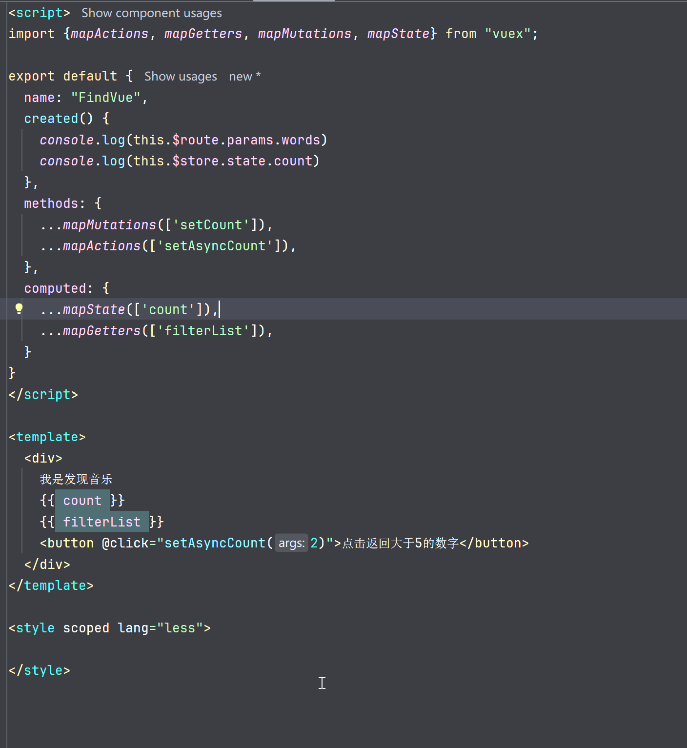 </script><template><div><hr>通过$store.getters[]的方式来获取:{{ $store.getters["user/filterUserList"] }}<br>通过mapGetters(未开启模块的命名空间)来获取:{{ userlist }}<br>通过mapGetters(开启模块的命名空间)来获取:{{ filterUserList }}<hr><button @click="setAsyncCount(2)">点击返回大于5的数字</button></div>