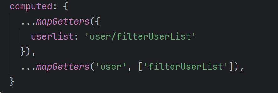 <script>import {mapGetters} from "vuex";export default {name: "FindVue",created() {console.log(this.$store.getters["user/filterUserList"])},computed: {...mapGetters({userlist: 'user/filterUserList'}),...mapGetters('user', ['filterUserList']),}