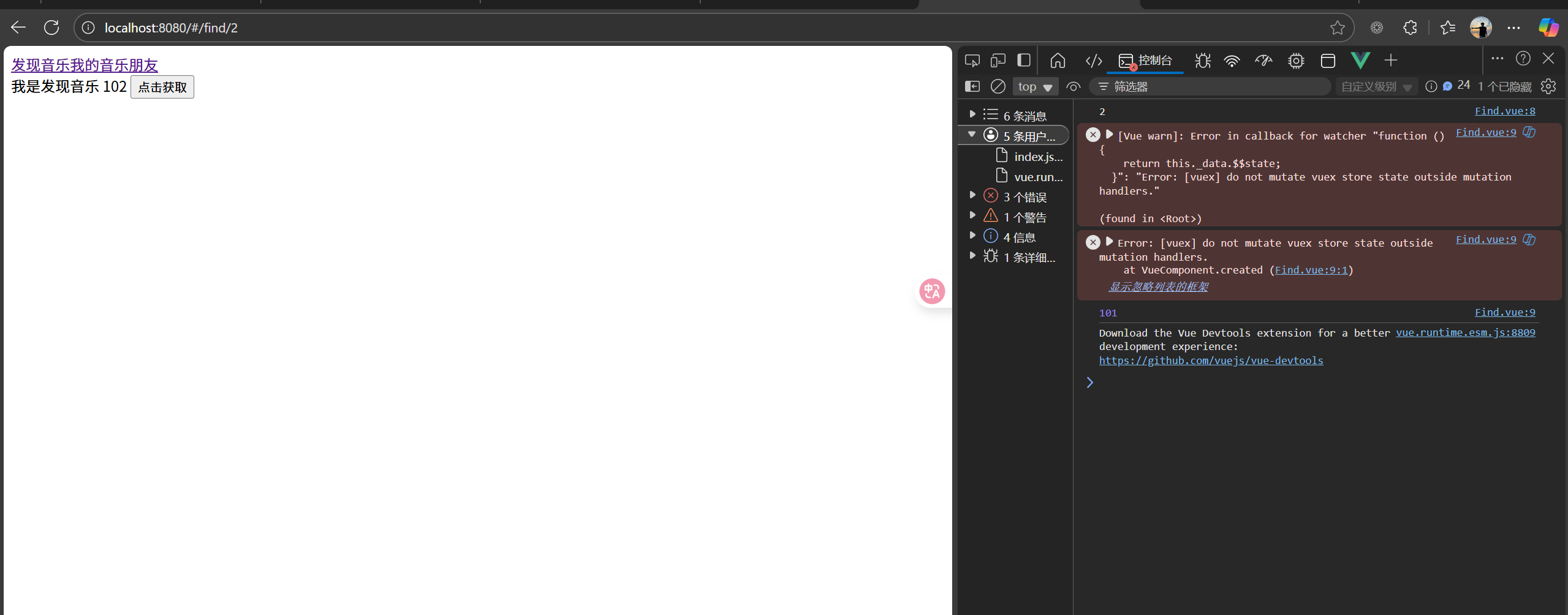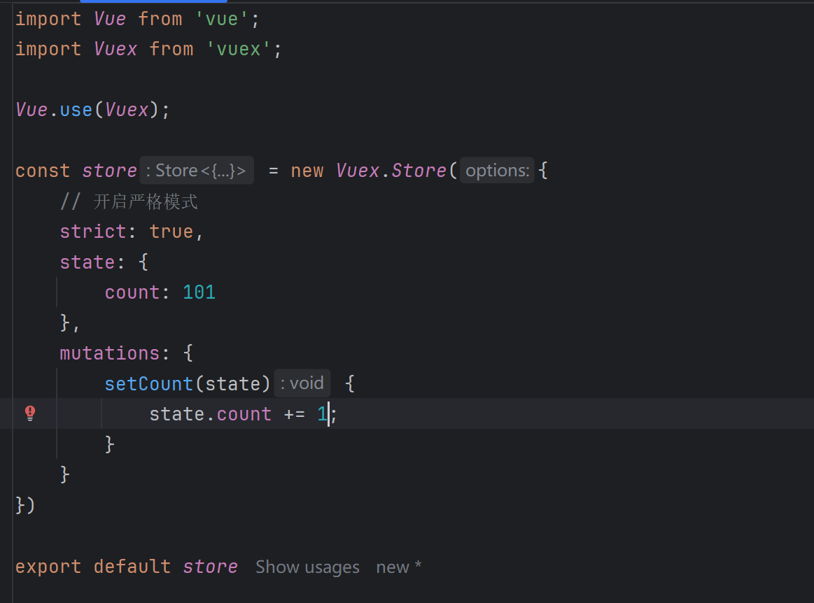 vuex中的数据同样遵循单向数据流,组件中不能直接修改仓库的数据,在使用共享数据的组件中,写类似this.$store.state.count++这样的代码是不对的,如果这样写了,Vue原生框架并不会直接报错,因为错误监测是非常消耗性能的。