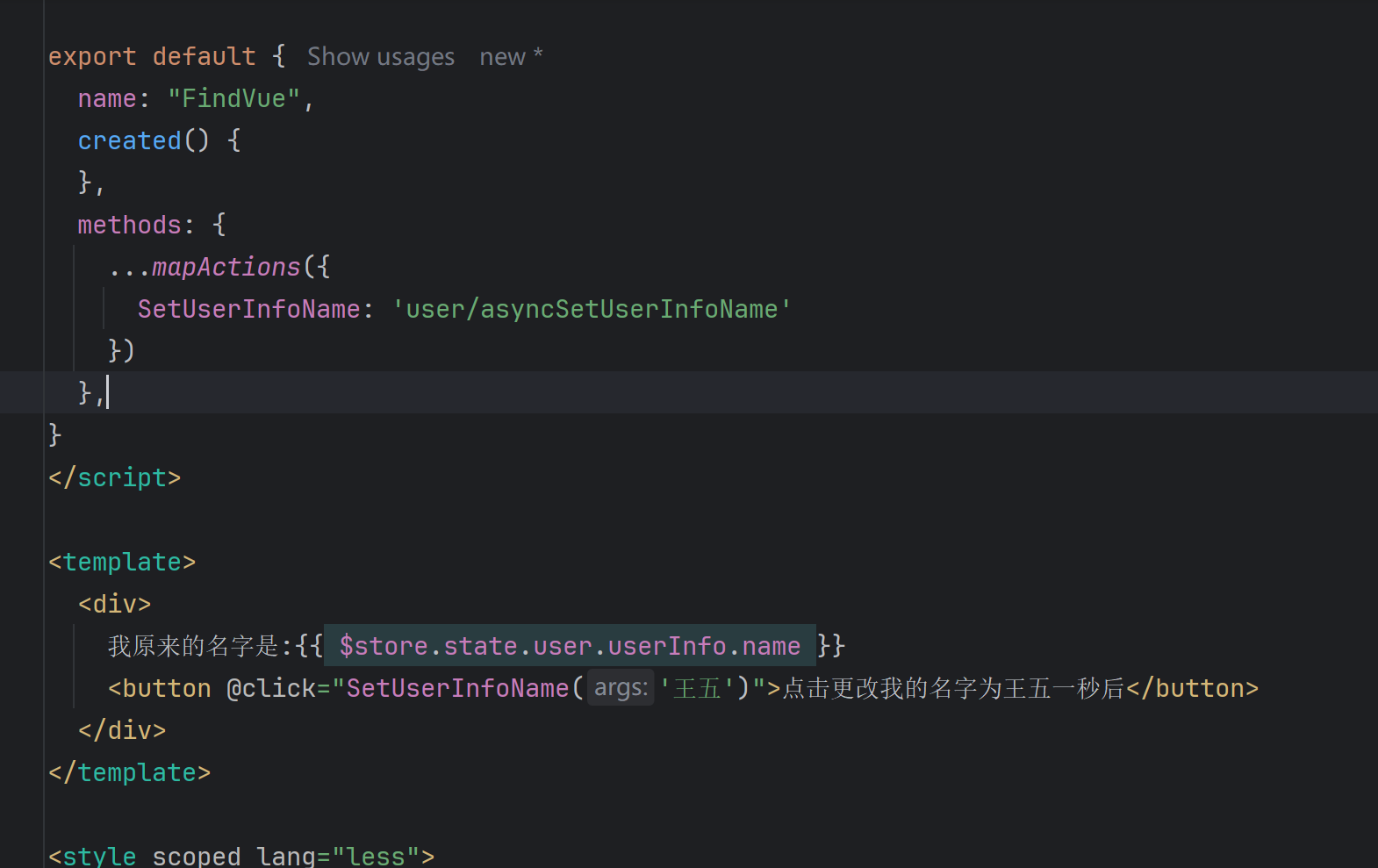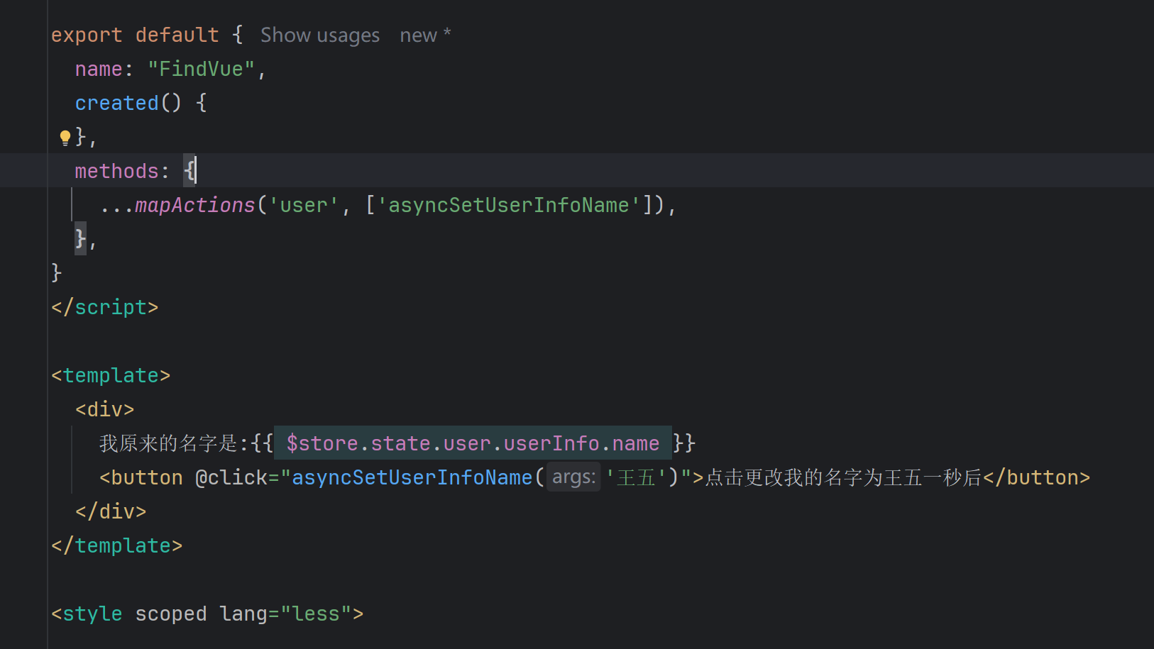 export default {namespaced: true,state: { name: '陈陈陈' },mutations: {setName(state, name) {state.name = name}},actions: {async fetchName({ commit }) {commit('setName', '新名字')}}