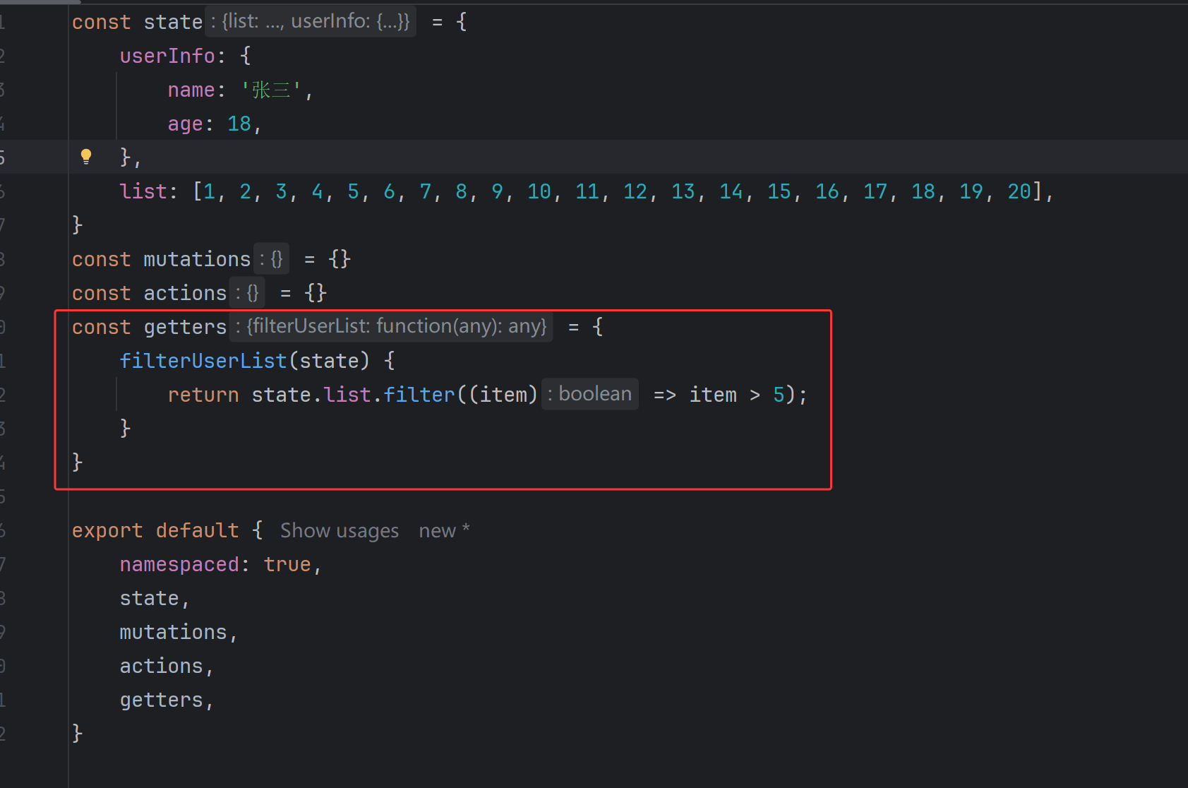有时我们还需要从state中派生出一些状态,这些状态是依赖state的,此时会用到getters。