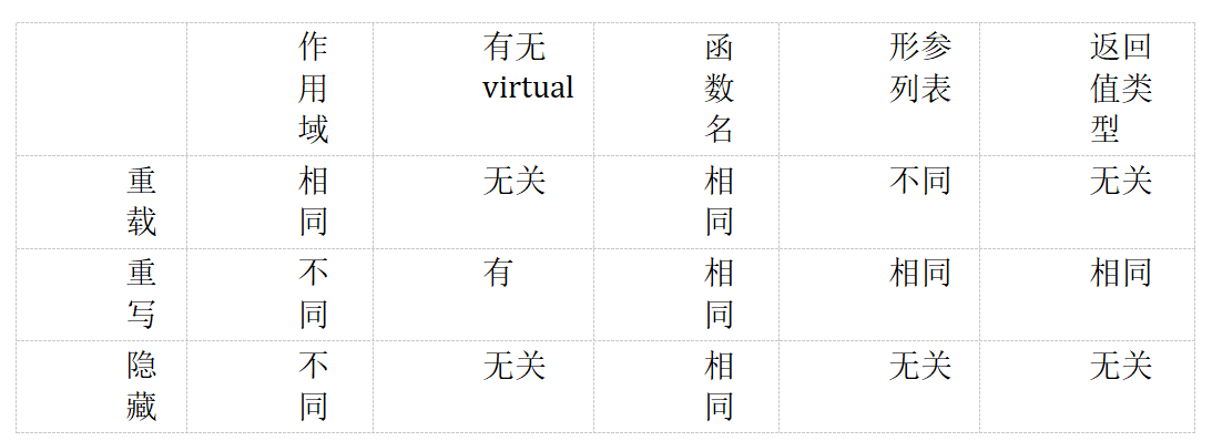 重载、重写、隐藏在定义、作用域、有无 virtual、函数名、形参列表、返回值类型等方面有区别。