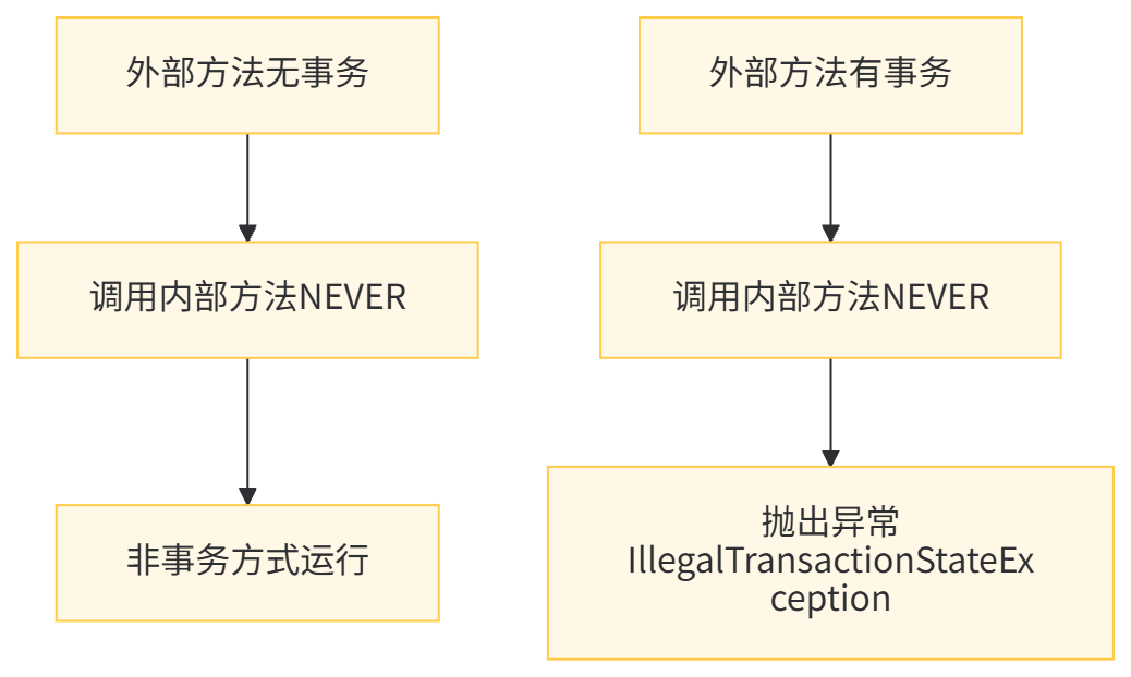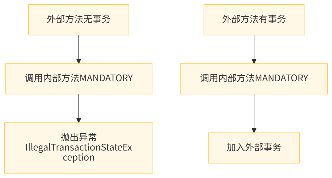适用场景:适用于那些必须在事务中执行的操作,确保这些操作不会在无事务的环境中执行。例如关键的金融操作,必须在事务保护下执行。