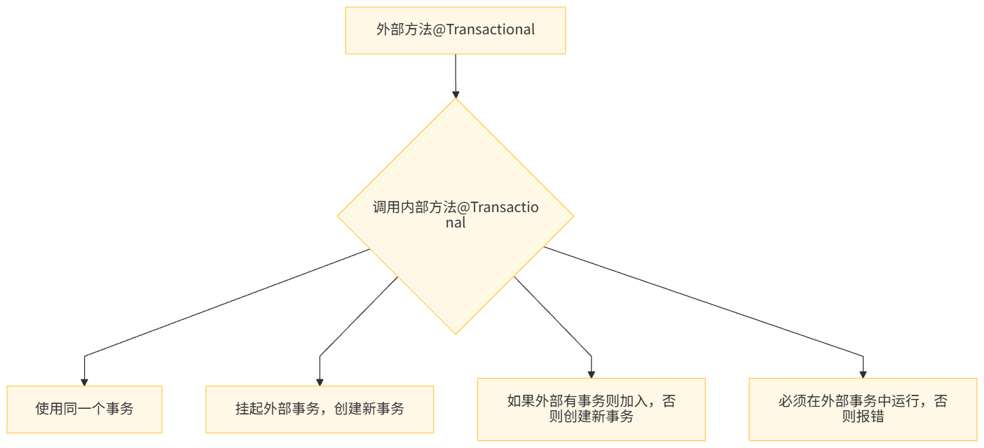 这些传播行为定义了内部方法如何与外部方法的事务进行交互,是 Spring 事务管理的核心。