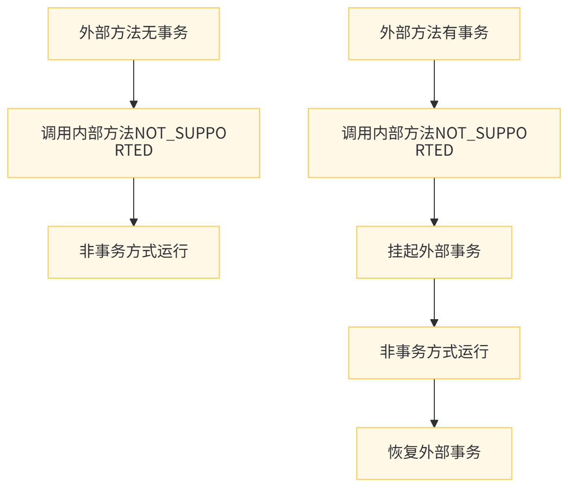 :如果加入外部事务,使用外部事务的隔离级别NOT_SUPPORTED