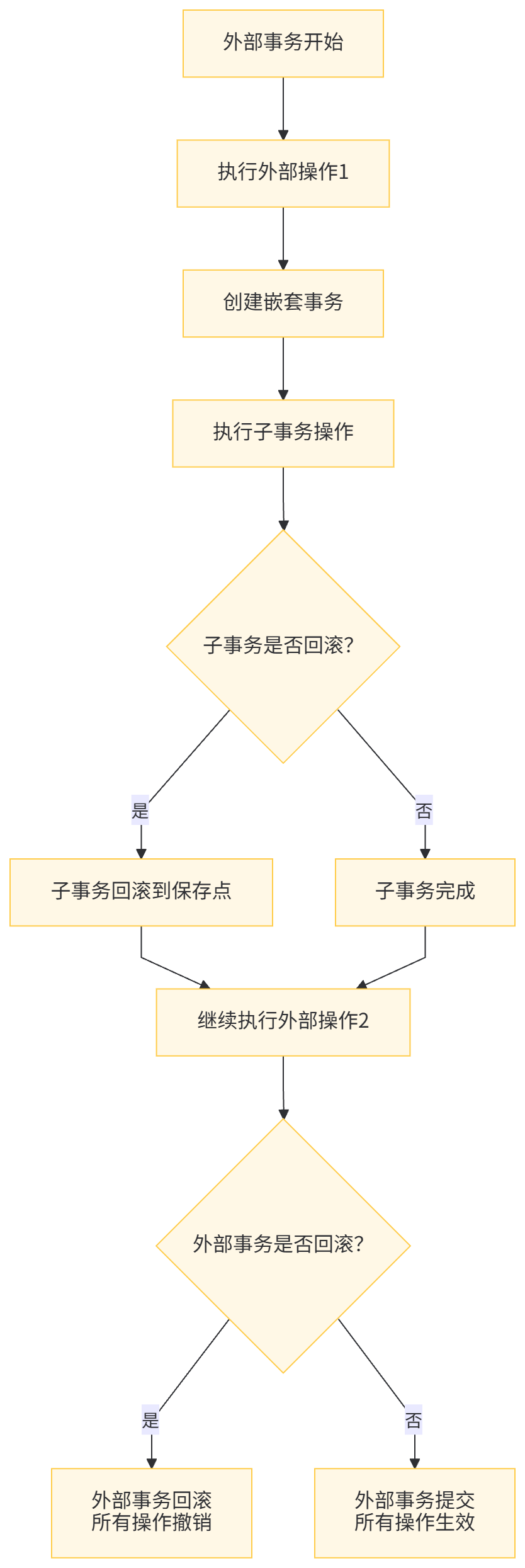 可以提高灵活性。部分回滚需求使用 NESTED:当需要部分回滚能力时,使用