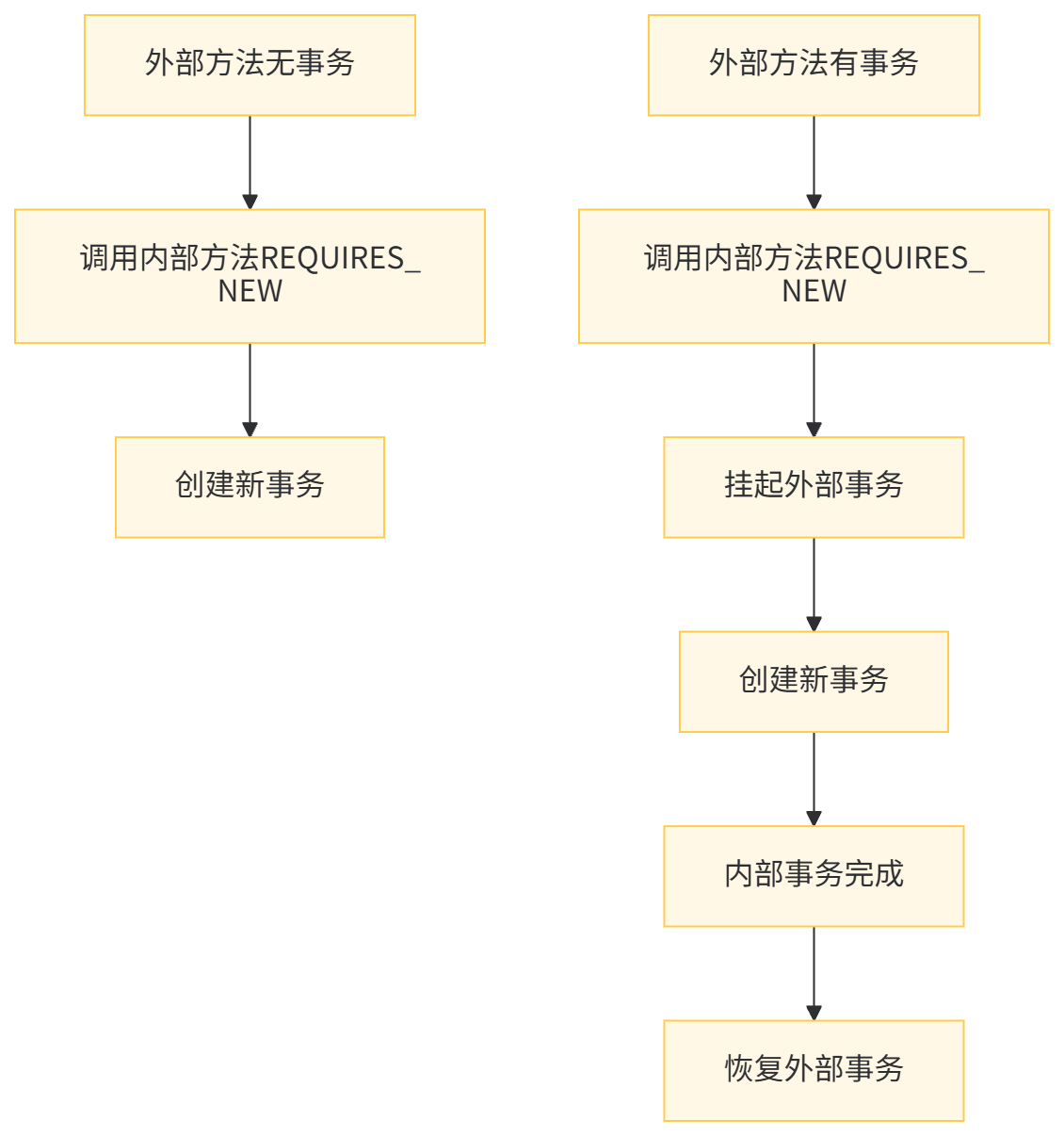 行为定义:无论当前是否存在事务,都创建一个新的事务。如果当前存在事务,则将当前事务挂起。