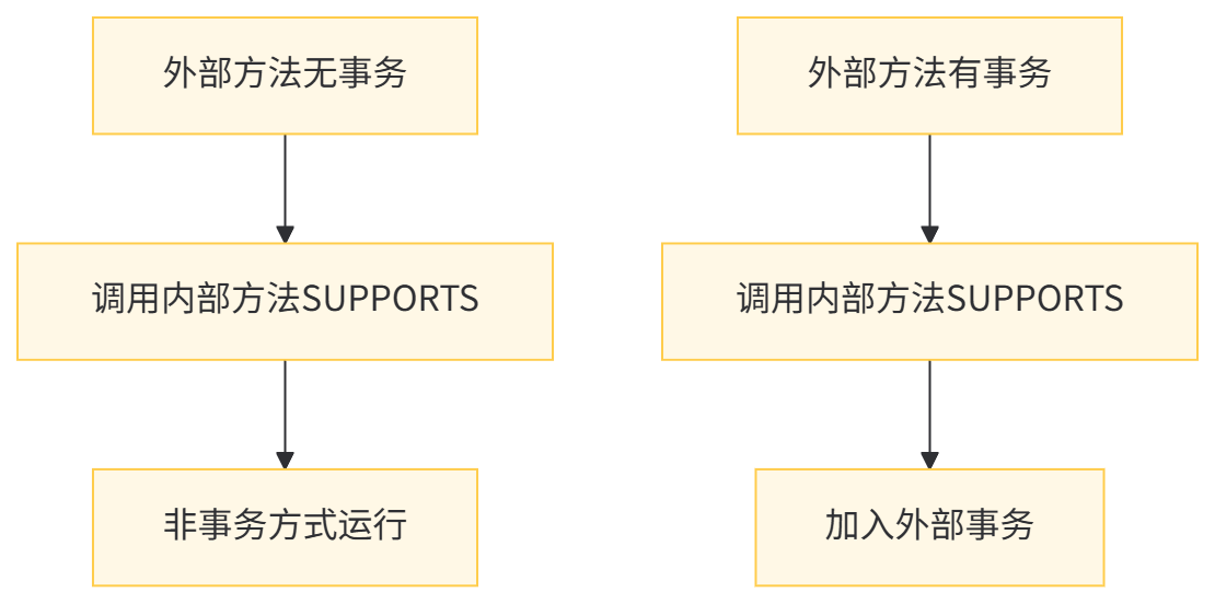 适用场景:适用于那些 "可选事务" 的方法,这些方法在有事务时就参与事务,没有事务时也能正常运行。例如查询操作,通常不需要事务,但如果已经在事务中执行,也可以参与事务。