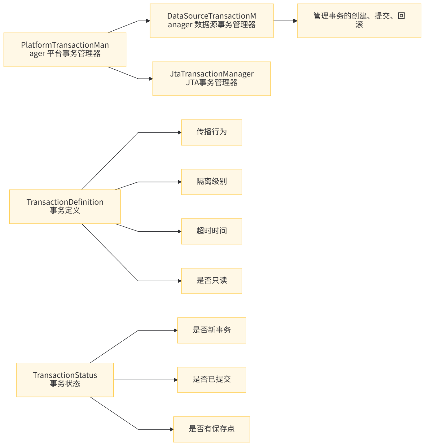 - PlatformTransactionManager:事务管理的核心接口,定义了事务的创建、提交和回滚方法