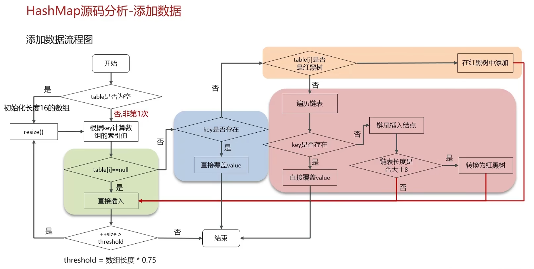 4.3、遍历table[i],链表的尾部插入数据,然后判断链表长度是否大于8,大于8的话把链表转换为红黑树,在红黑树中执行插入操作,遍历过程中若发现key已经存在直接覆盖value。