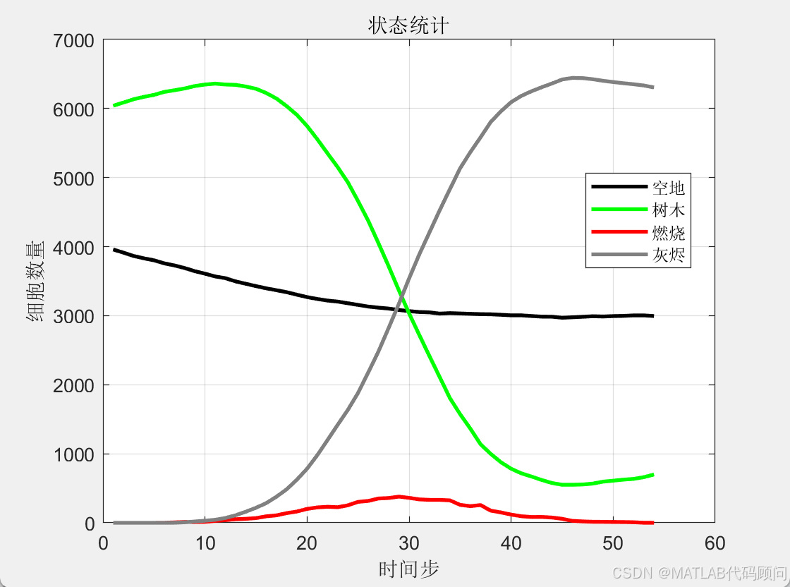 legend('空地', '树木', '燃烧', '灰烬', 'Location', 'best');