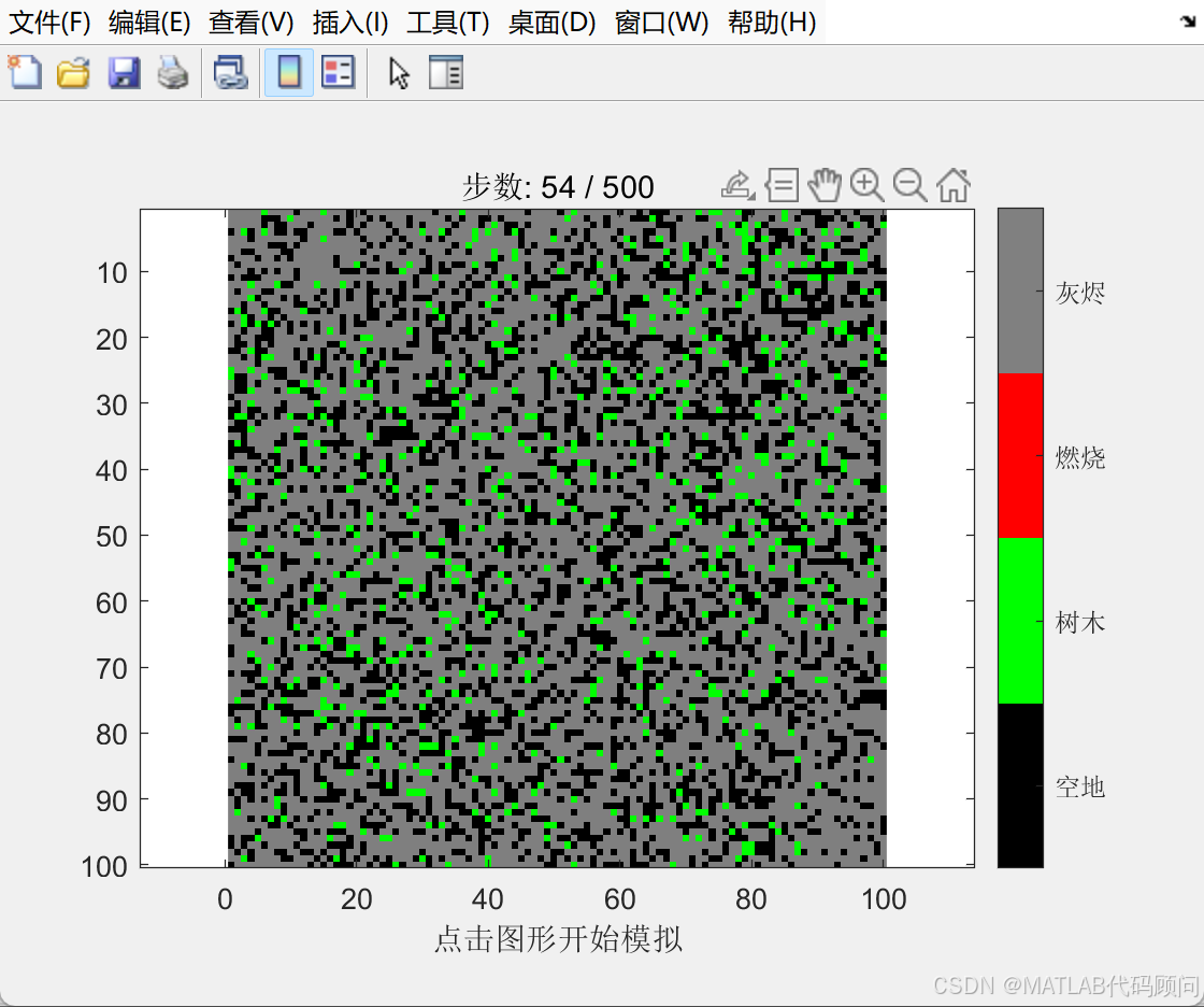 colorbar('Ticks',[0.375,1.125,1.875,2.625],...'TickLabels',{'空地','树木','燃烧','灰烬'});% 等待用户点击开始