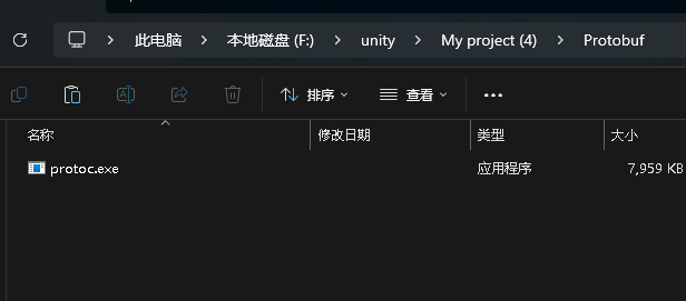 解压后获取 bin 文件夹中的 protoc.exe 可执行文件,可将其放入 Unity 工程中,方便之后的使用(你也可以不放入 Unity 工程,记住它的路径即可)