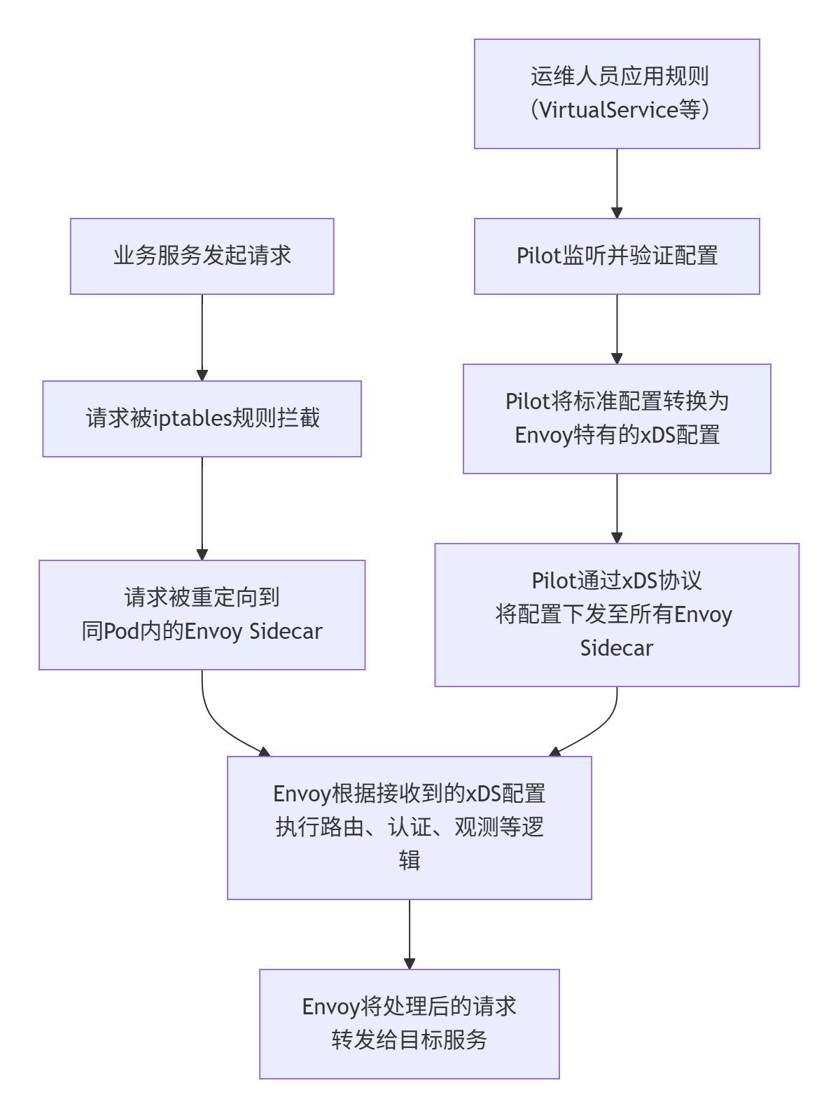 流程精髓:iptables 实现透明拦截,xDS 协议实现动态控制。应用无感知,运维人员通过高级 API 统一管理,Envoy 负责高性能执行。这种解耦架构是 Istio 强大威力的根源。