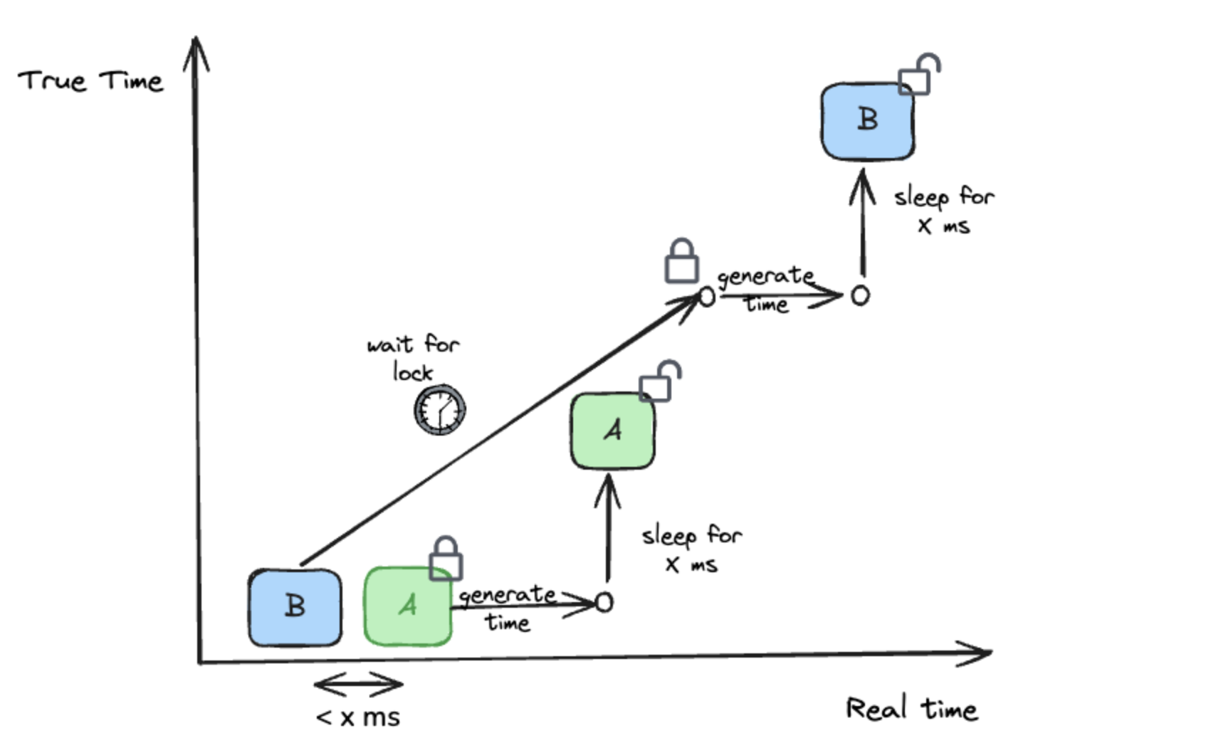 上图显示了进程 A 和 B 生成的时间如何单调增加,即使进程 B 在开始时的本地时钟比 A 低,但通过等待 x ms 的不确定性窗口过去。