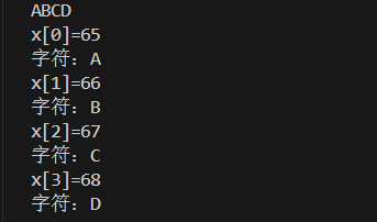 {char x[4];int count = sizeof(x);x[0] = getchar();x[1] = getchar();x[2] = getchar();x[3] = getchar();for (size_t n = 0; n < count; n++){printf("x[%d]=%d\n", n, x[n]);printf("字符:%c\n", x[n]);}
