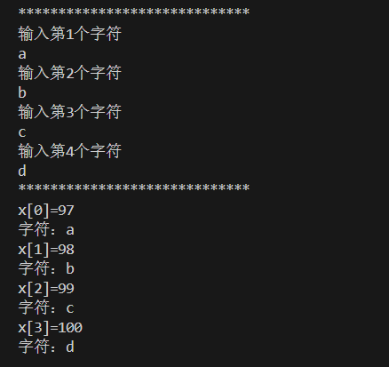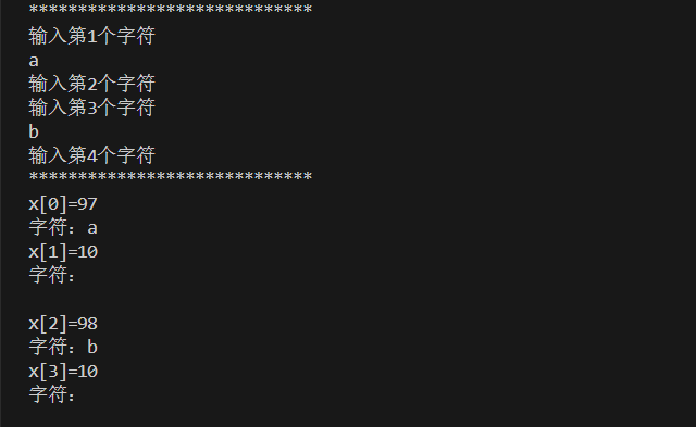 {char x[4];int count = sizeof(x);printf("*****************************\n");for (size_t i = 0; i < count; i++){printf("输入第%d个字符\n", i + 1);x[i] = getchar();getchar();//吸收缓冲区内的换行符}printf("*****************************\n");for (size_t n = 0; n < count; n++){printf("x[%d]=%d\n", n, x[n]);printf("字符:%c\n", x[n]);}