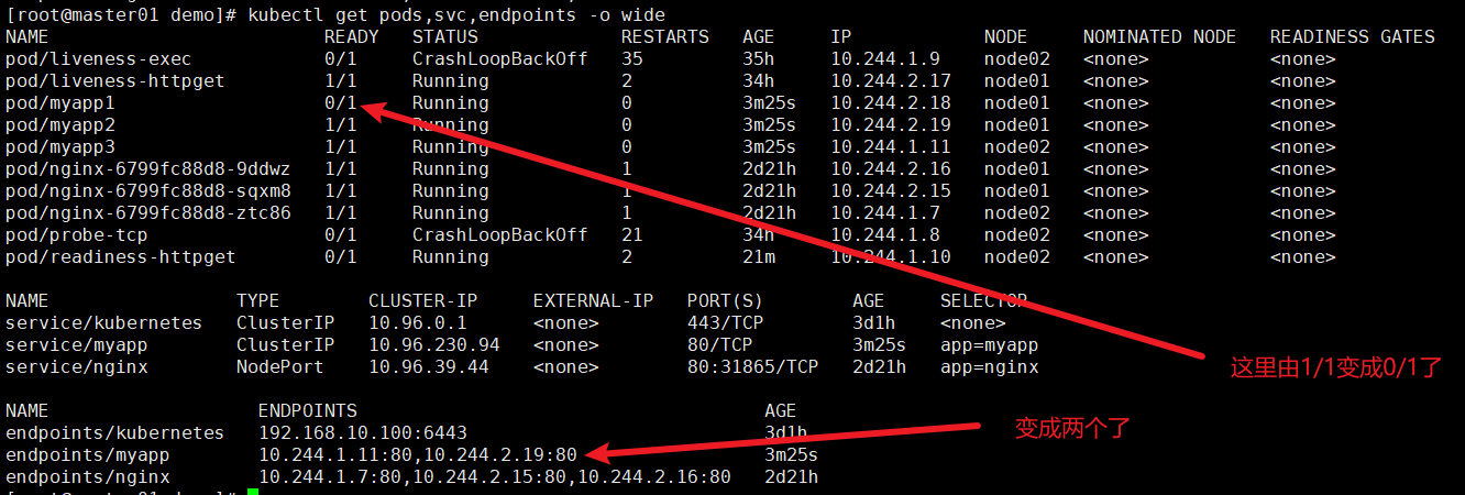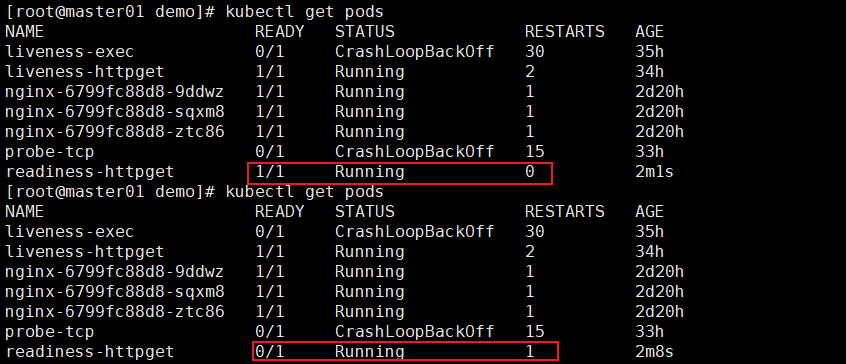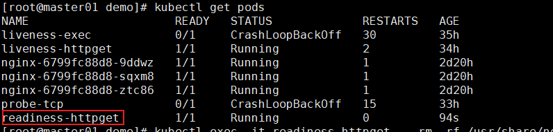 kubectl exec -it readiness-httpget -- rm -rf /usr/share/nginx/html/index.htmlkubectl get pods -w
