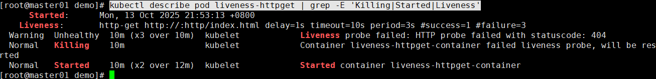 kubectl describe pod liveness-httpget | grep -E 'Killing|Started|Liveness'