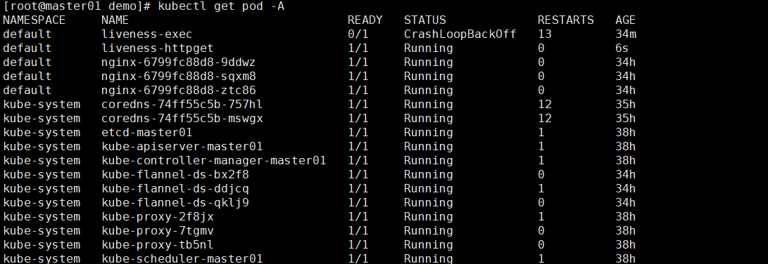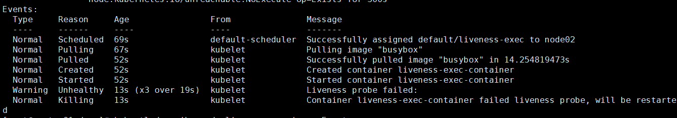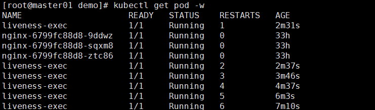 spec:containers:- name: liveness-exec-containerimage: busyboximagePullPolicy: IfNotPresentcommand: ["/bin/sh","-c","touch /tmp/live ; sleep 30; rm -rf /tmp/live; sleep 60"] # livenessProbe:exec:command: ["test","-e","/tmp/live"]initialDelaySeconds: 1periodSeconds: 3# 运行