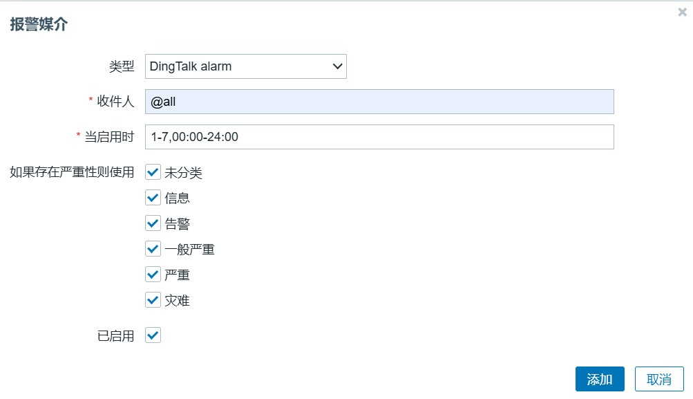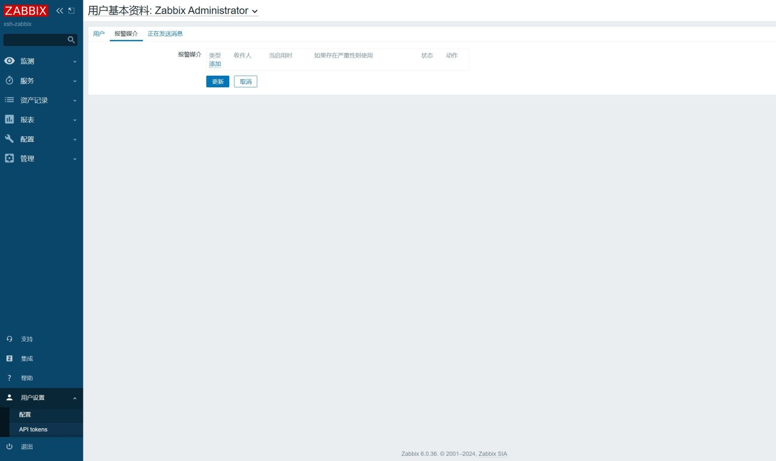 进入: 管理 → 用户 → 选择用户(如 Admin)→ 报警媒介 → 添加