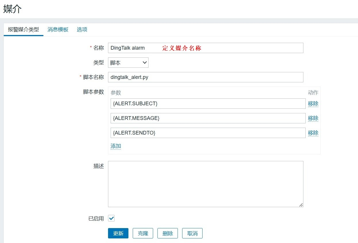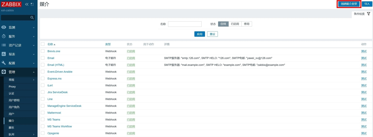 登录 Zabbix Web 界面,进入: 管理 → 报警媒介类型 → 创建媒介类型