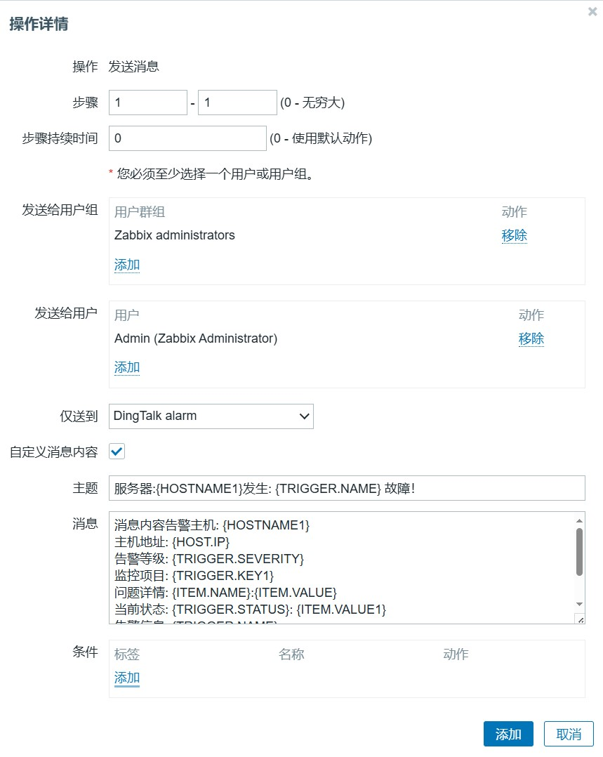 sudo chmod +x /usr/local/zabbix/share/zabbix/alertscripts/dingtalk_alert.py # 添加执行权限
