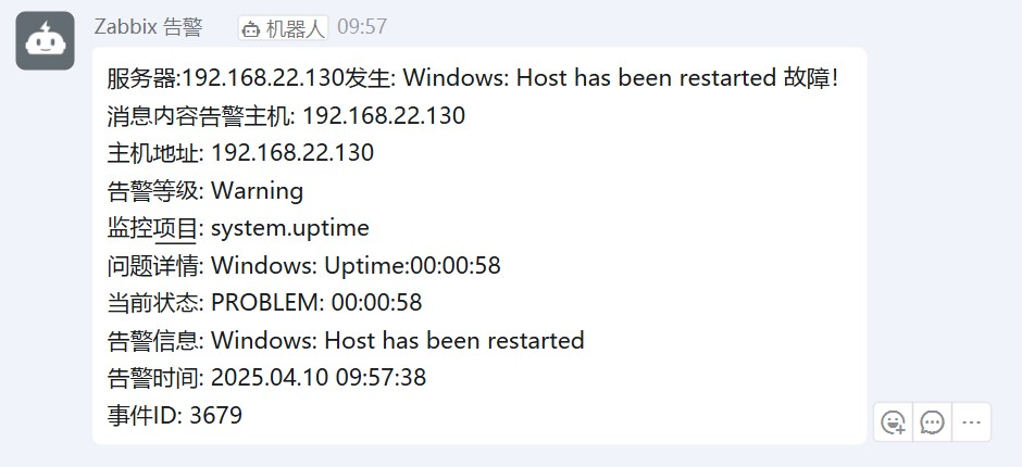 python3 /usr/local/zabbix/share/zabbix/alertscripts/dingtalk_alert.py "测试标题" "告警"