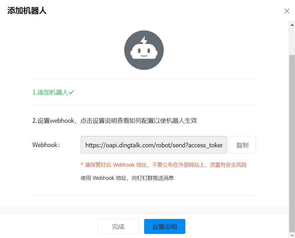 - 选择“加签”方式(推荐),并复制生成的 Webhook URL。