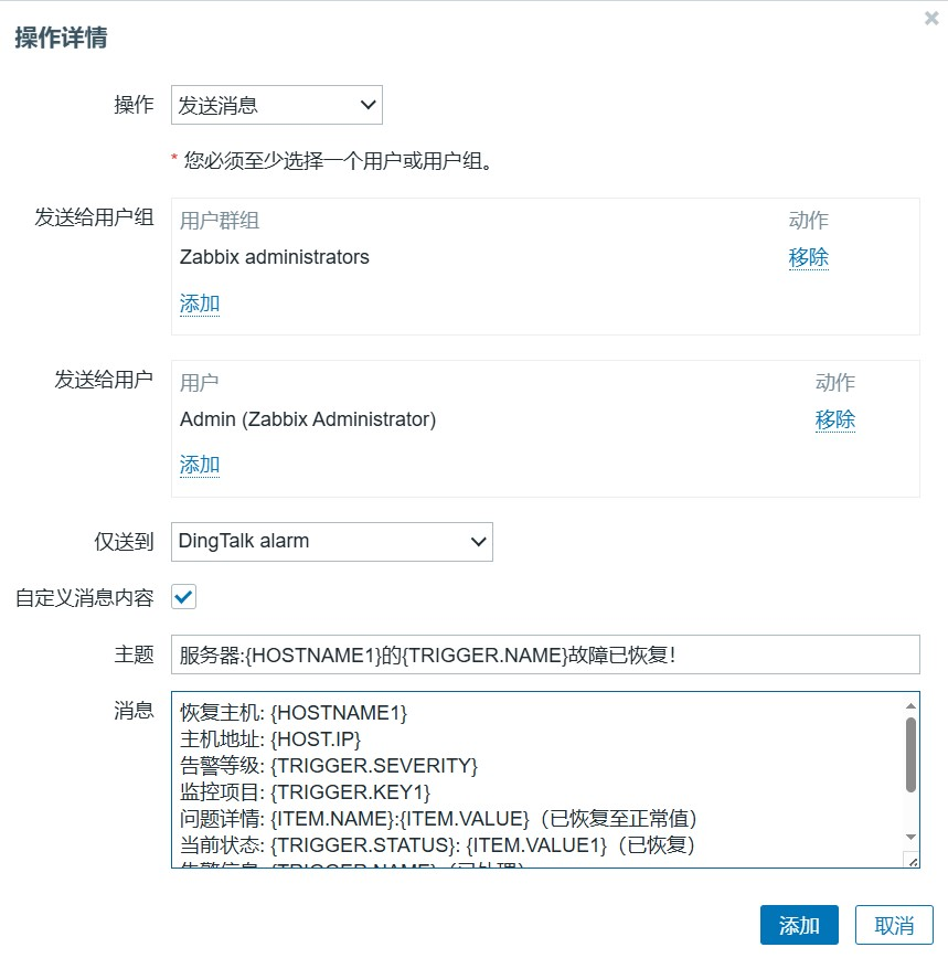 🟢 恢复主机: {HOSTNAME1}主机地址: {HOST.IP}告警等级: {TRIGGER.SEVERITY}监控项目: {TRIGGER.KEY1}问题详情: {ITEM.NAME} = {ITEM.VALUE}(已恢复正常)当前状态: {TRIGGER.STATUS}告警信息: {TRIGGER.NAME}(已恢复)恢复时间: {EVENT.DATE} {EVENT.TIME}事件ID: {EVENT.ID}