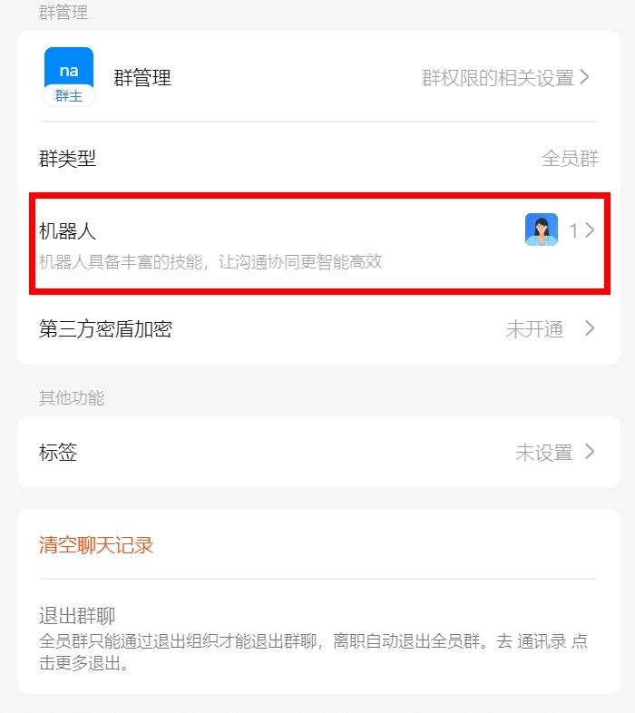 进入刚创建的群聊,点击右上角的“群设置”图标(齿轮图标),然后选择“智能群助手” → “添加机器人” → “自定义机器人”。